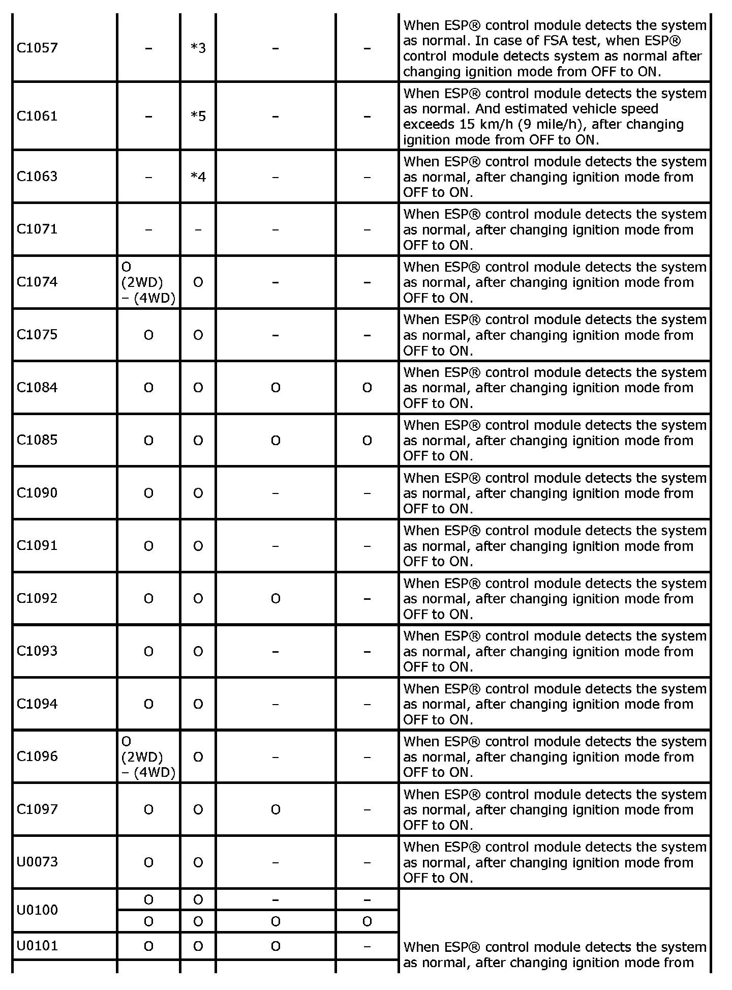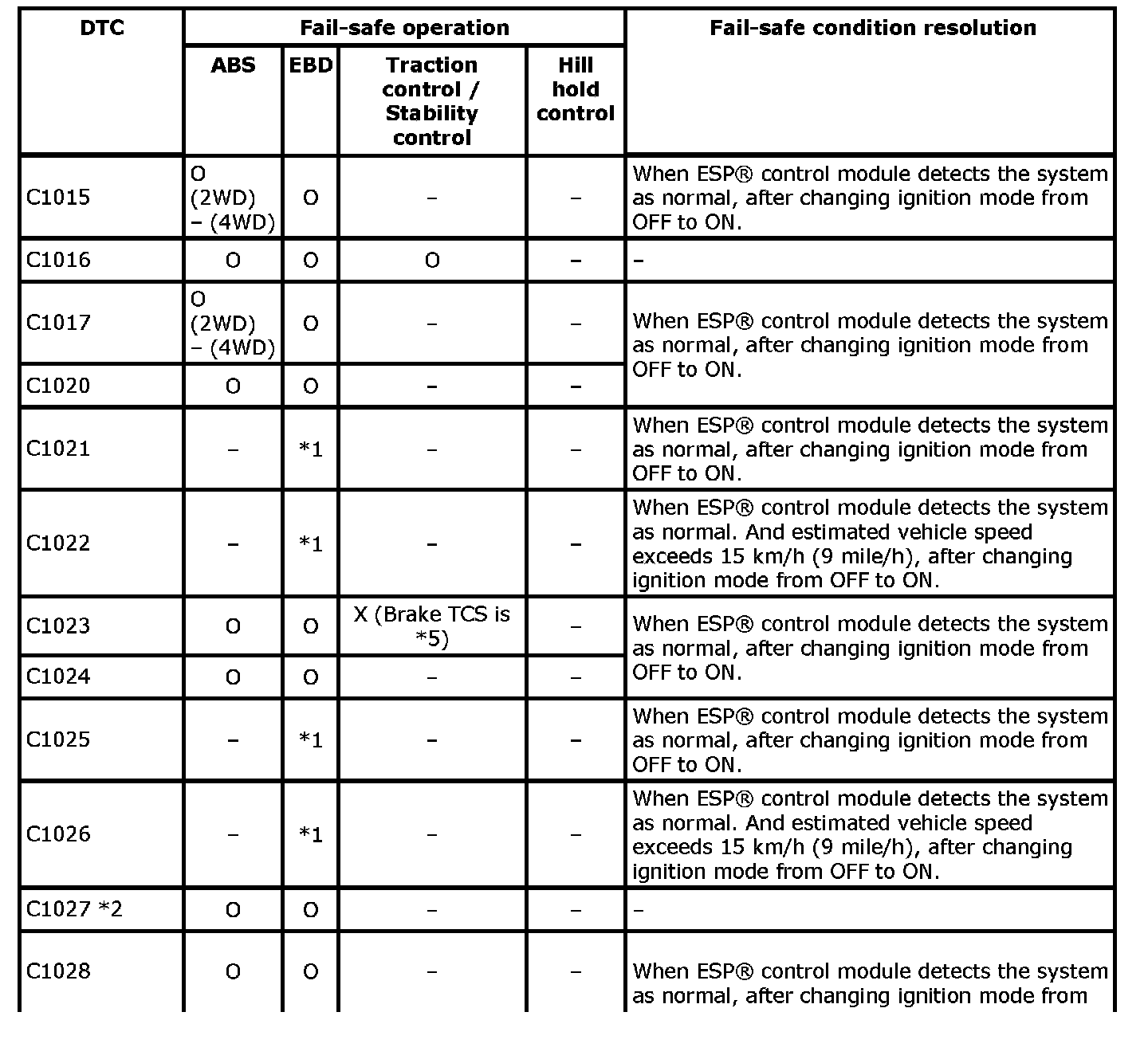 Fail-Safe TableWhen any of the following DTC(s) is detected, ESP(R) system is in fail-safe mode per its DTC and ABS, EBD, traction control, stability control are deactivated until the resolution is applied.