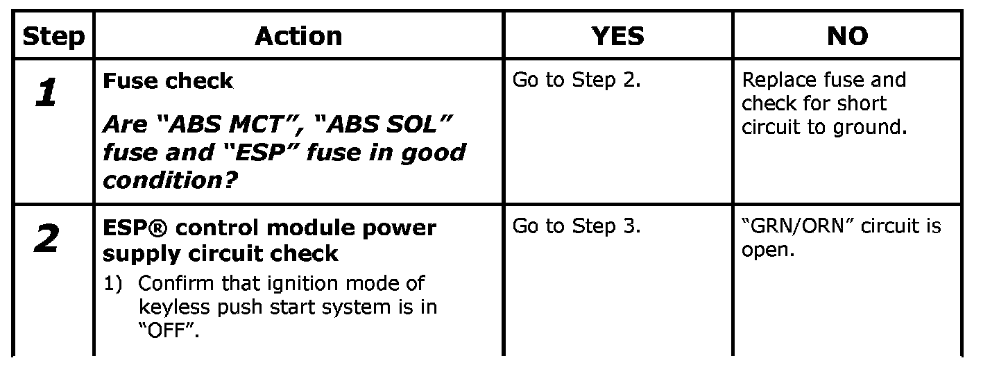 When the ignition mode of keyless push start system is change to "ON", power is supplied to ESP(R) control module. Then power is supplied to pump motor and solenoid valve in other line by the switching function in ESP(R) control module.
