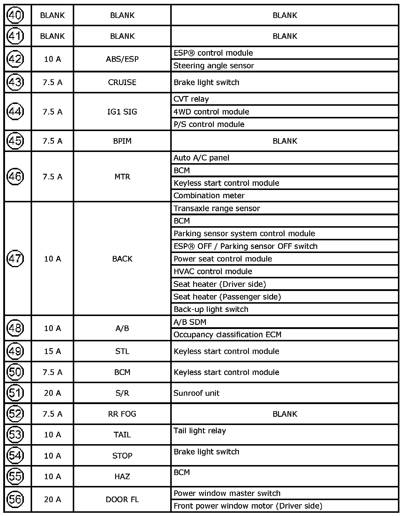 Fuse Box No. 2 Application Table Fuse 40-Fuse 56:
