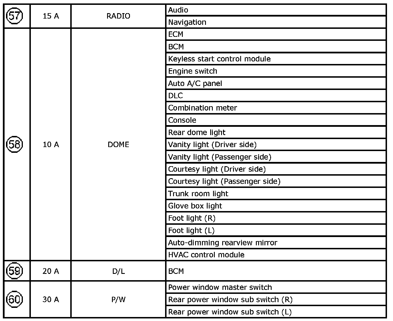 Fuse Box No. 2 Application Table Fuse 57-Fuse 60: