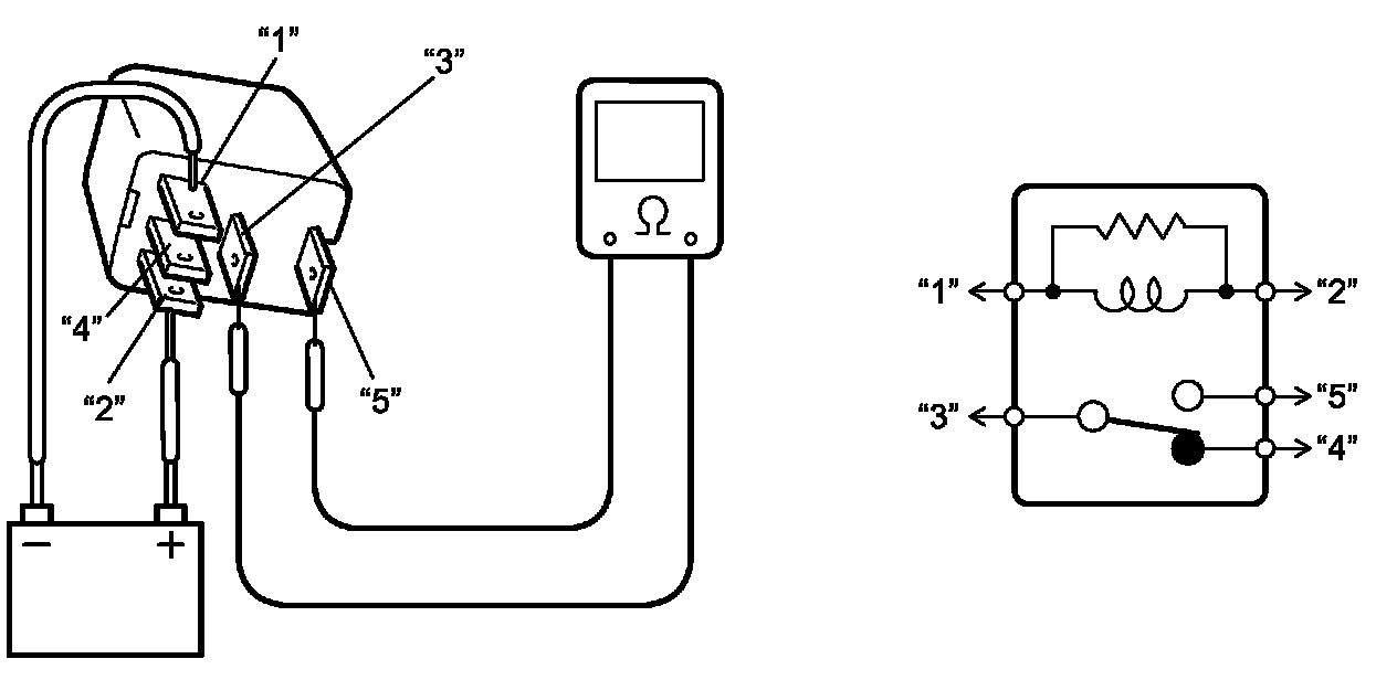 4. Connect battery positive (+) terminal and negative (-) terminal to relay as shown in figure, check for continuity between terminal "3" and "4".