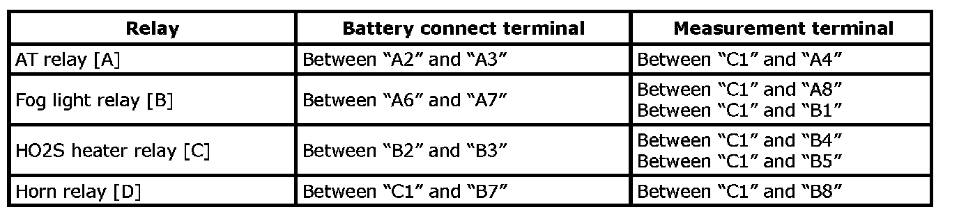 3. Following the table, for each relay, check continuity between switch side terminals when battery voltage is acting between coil side terminals.