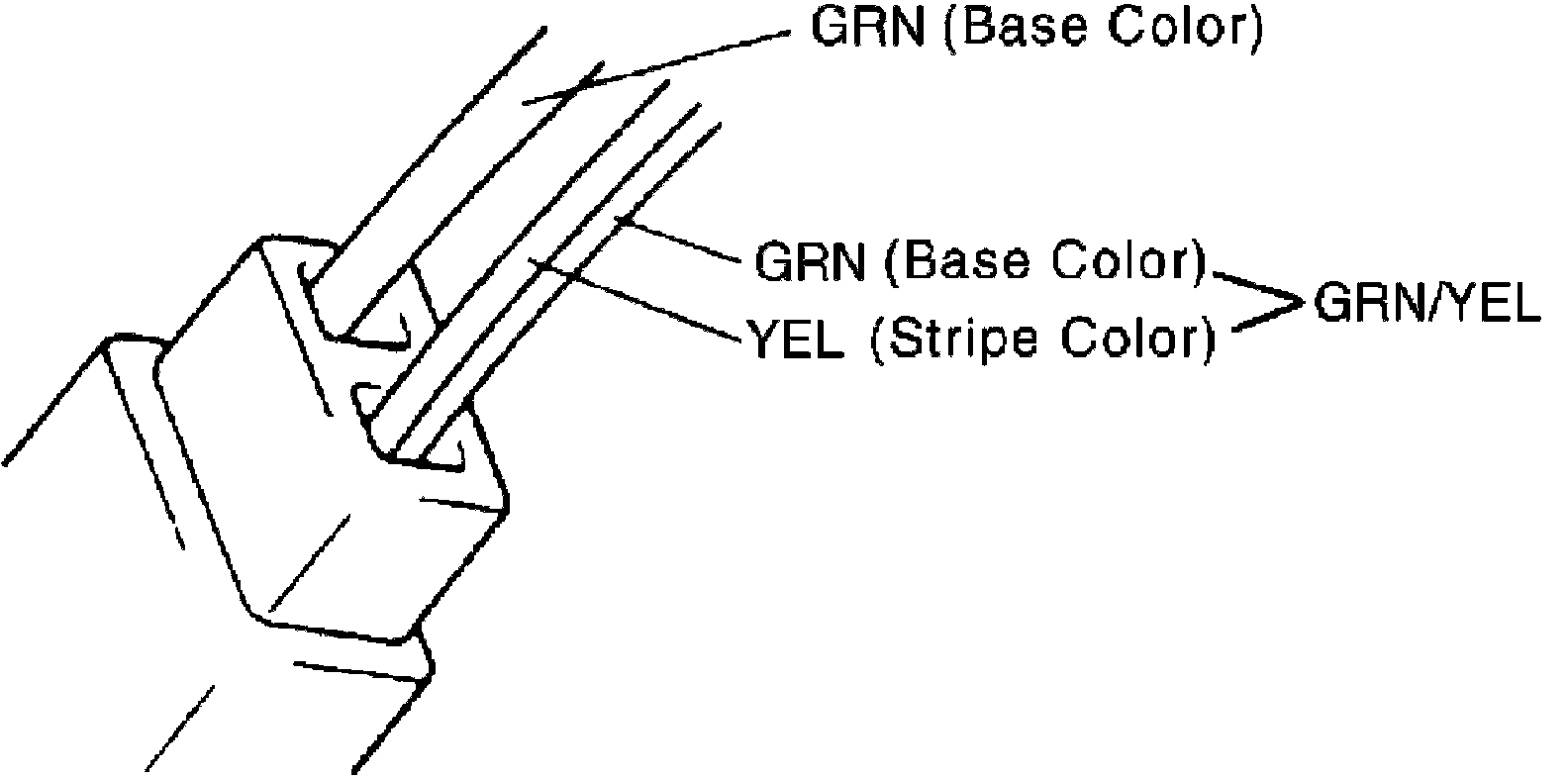 The dual-colored type of wire uses two color symbols (i.e. "GRN/YEL"). The first symbol represents the base color of the wire ("GRN" in the figure) and the second symbol represents the color of the stripe ("YEL" in the figure).