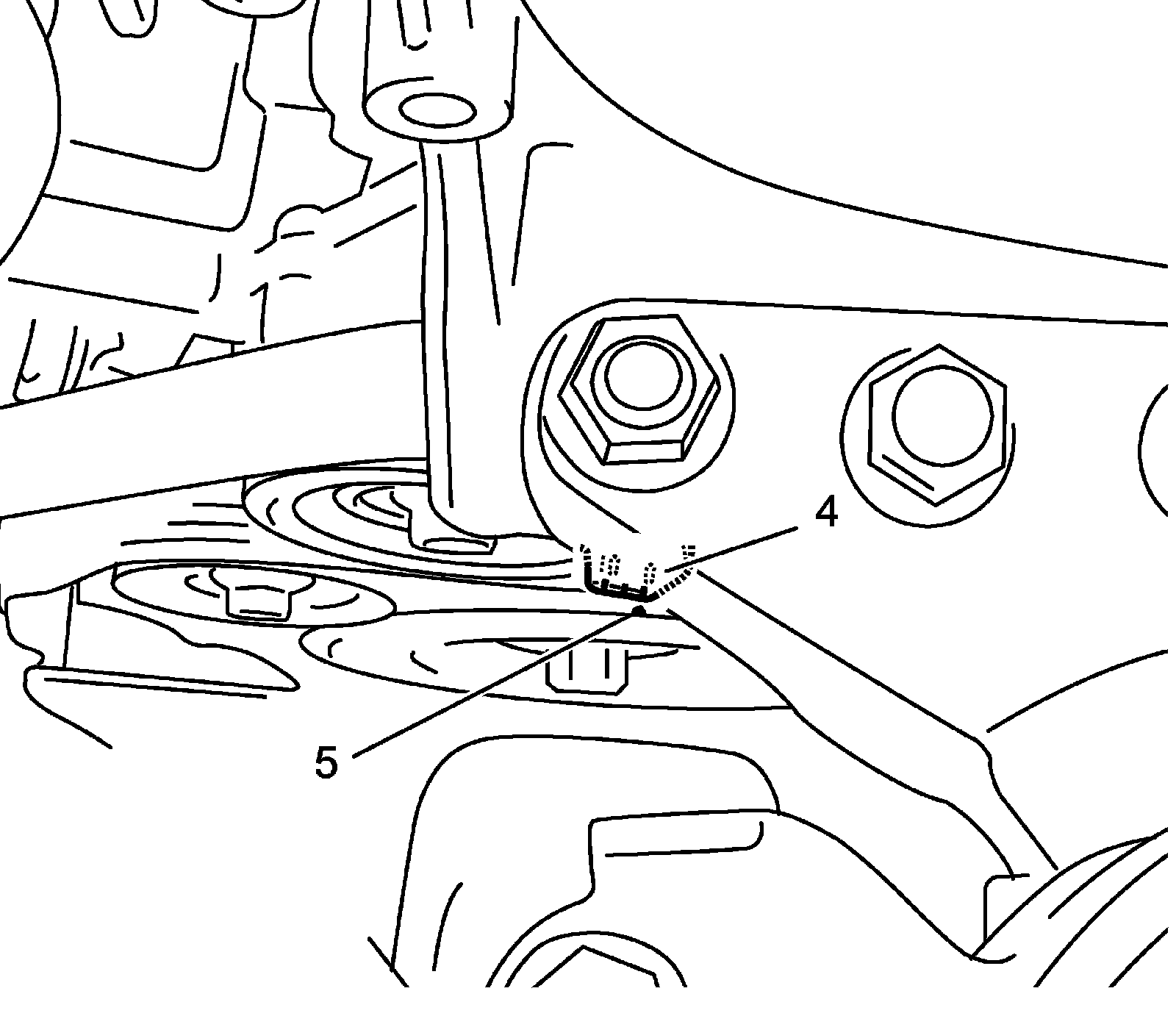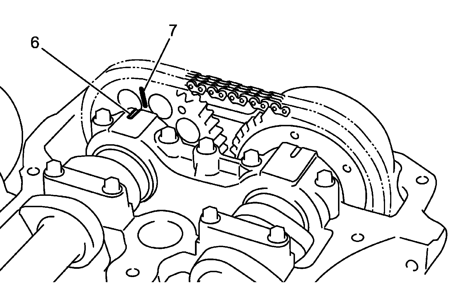 3) Insert socket wrench through service hole (2) of front fender lower lining (1). Turn crankshaft pulley (3) clockwise and align crankshaft pulley notch mark (5) with timing chain cover at 0 degrees (TDC) mark (4). Matchmark camshaft housing No.1 (6) and exhaust camshaft timing sprocket (7) have to be aligned.