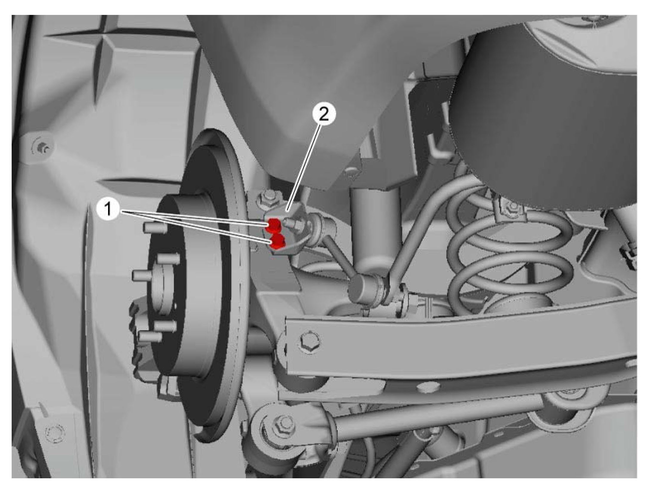 1) Remove rear stabilizer bracket mount bolts (1) to remove rear stabilizer joint bracket (2) from suspension knuckle on each side.