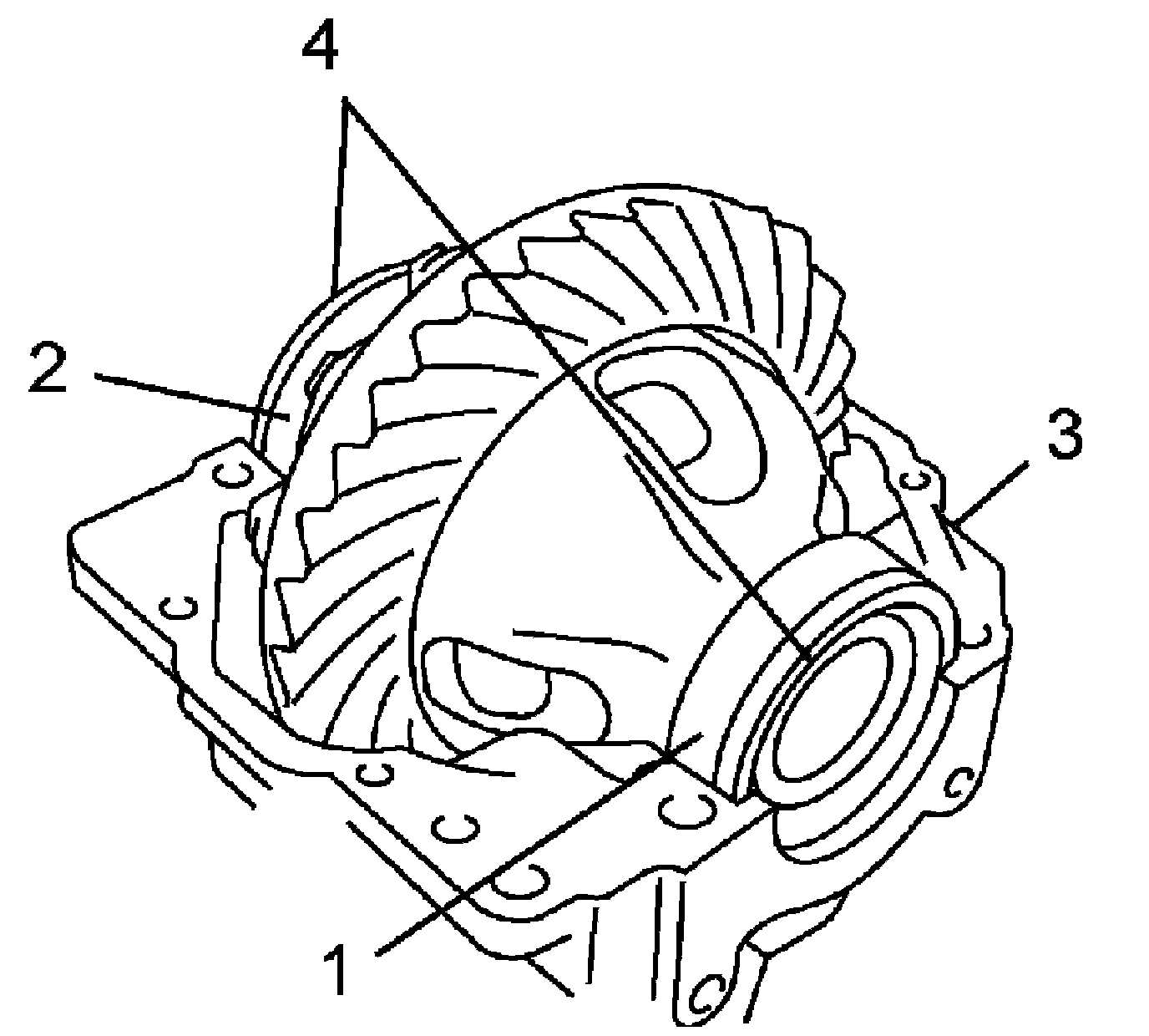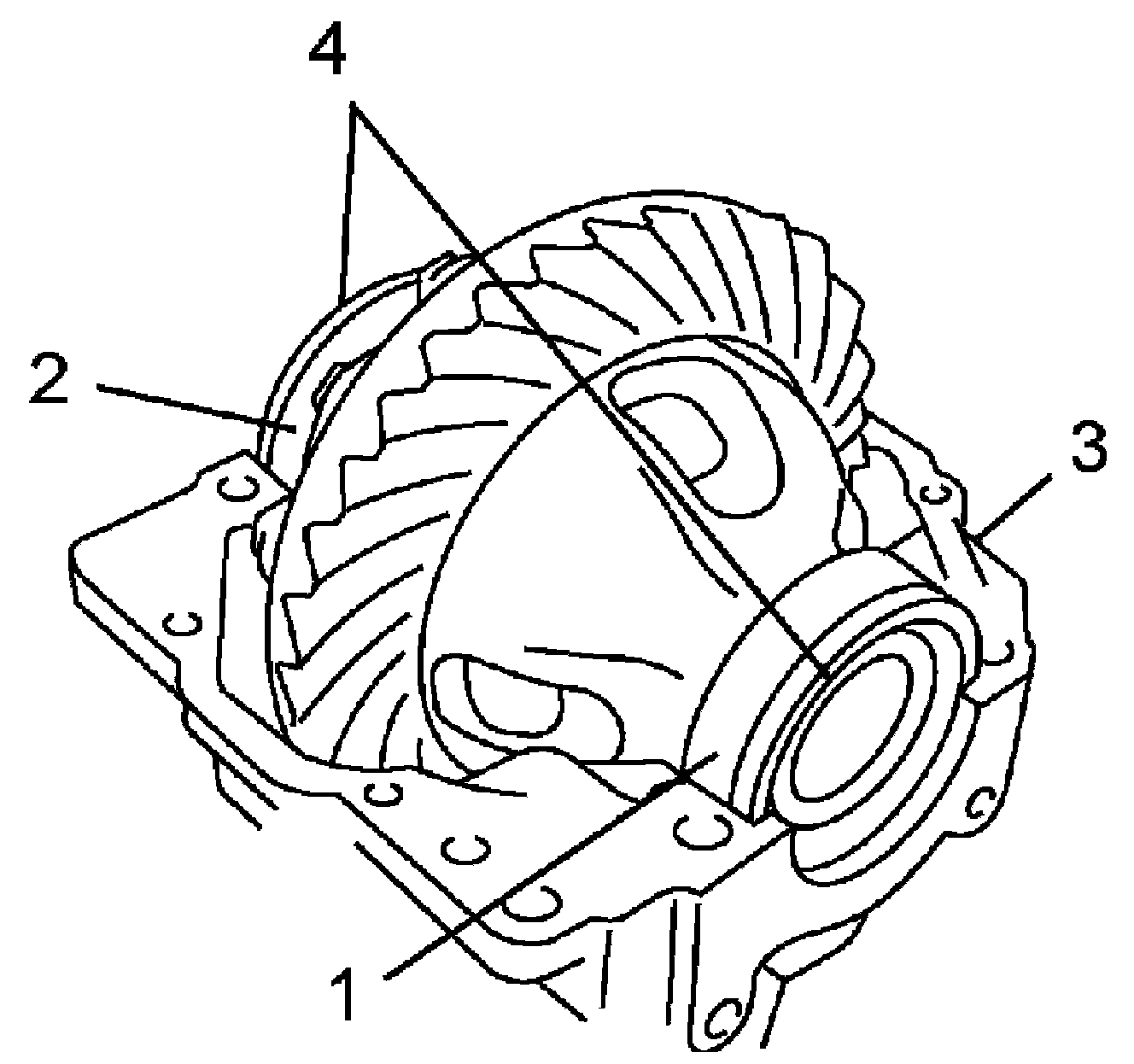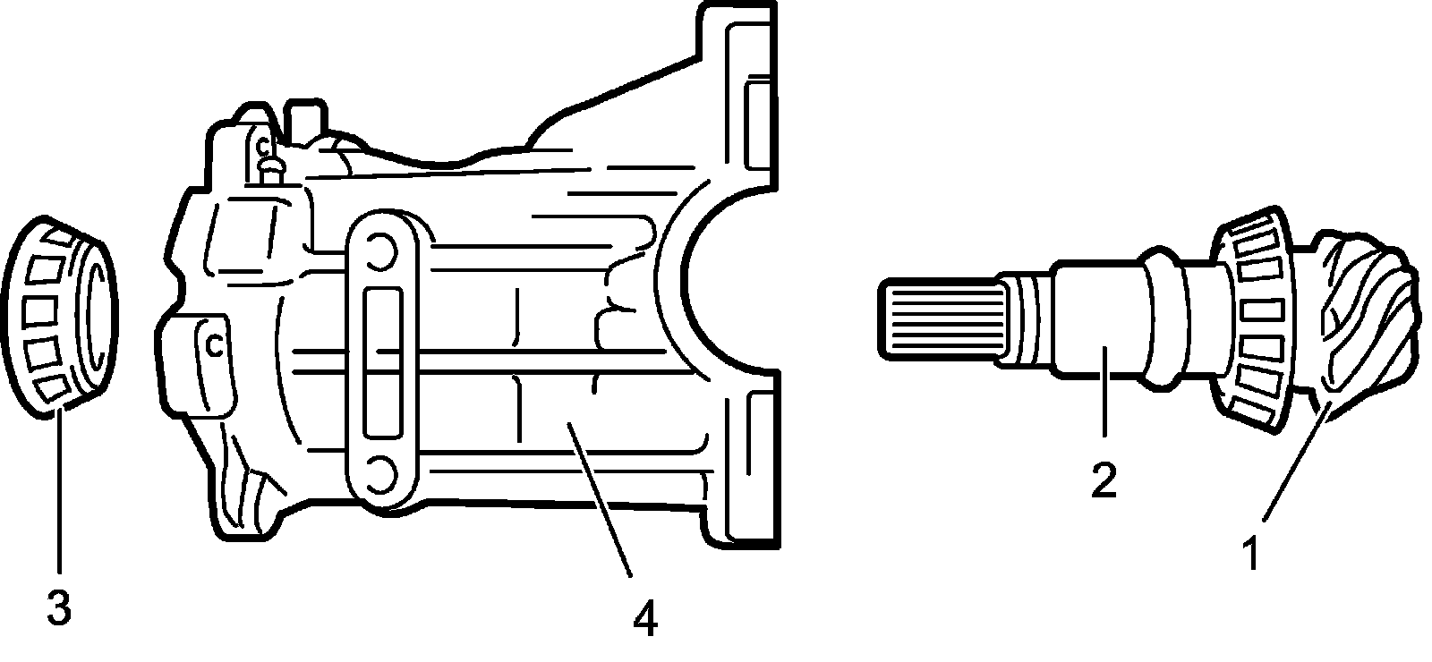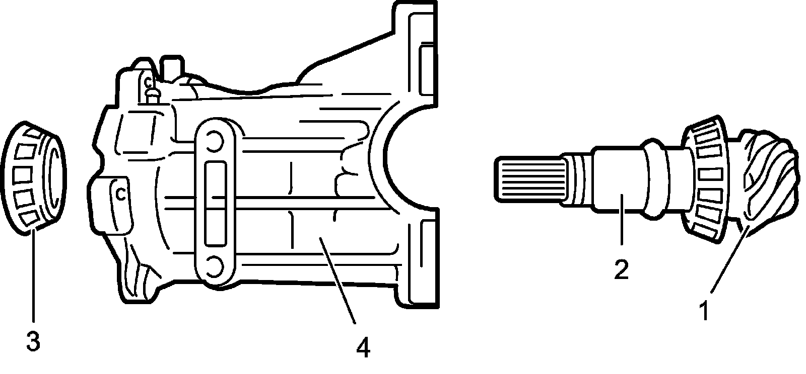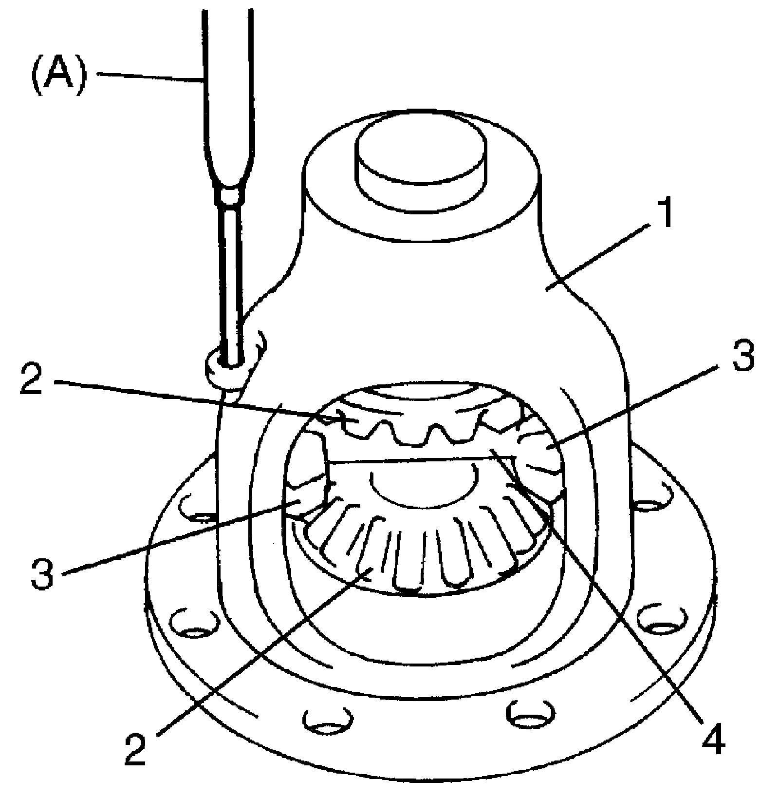 18) Disassemble differential gears (2), pinions (3), washers and shaft (4) in differential case (1).