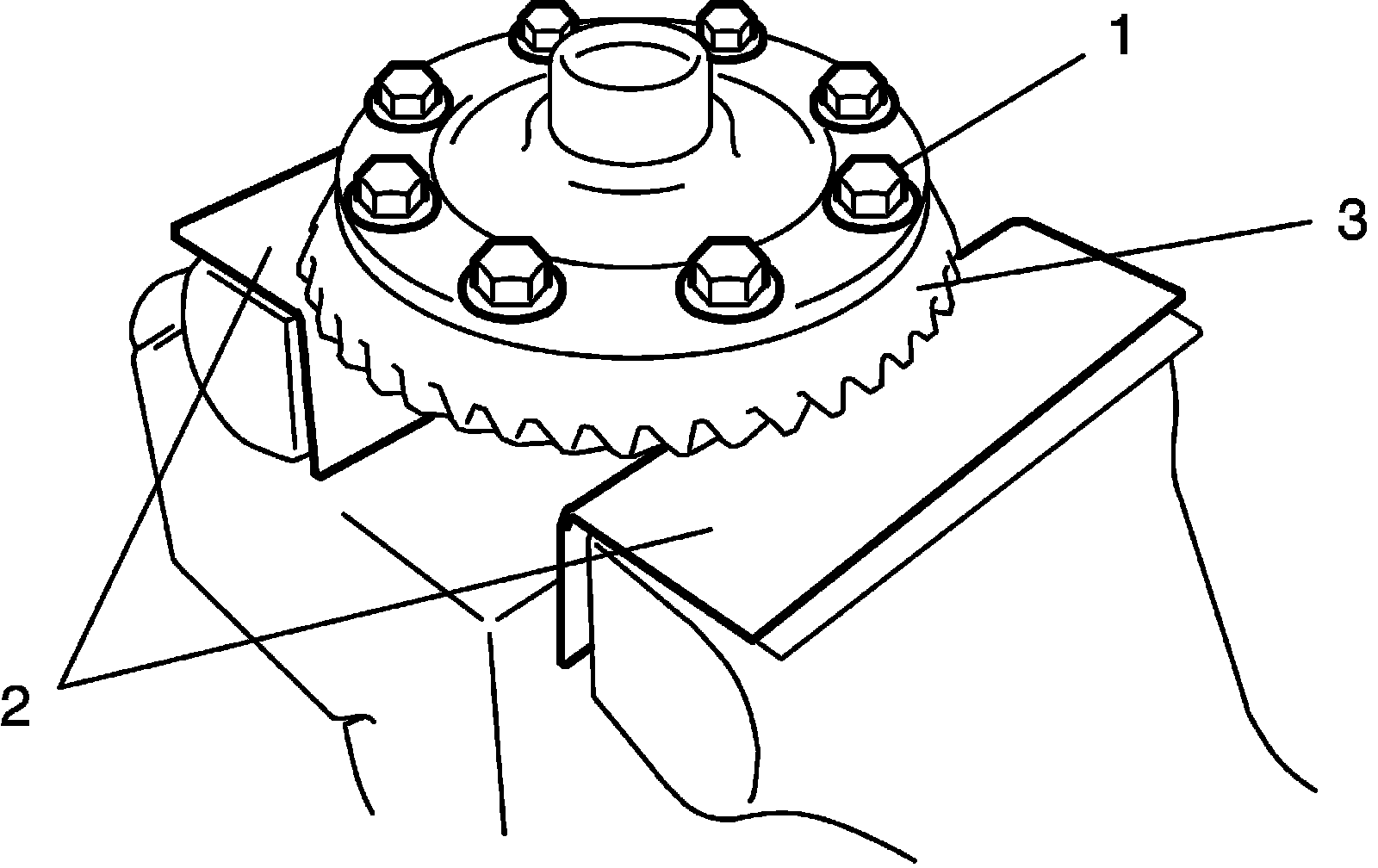 13) Put bevel gear (2) on differential case (3) and tighten them with new bolts (1) to specified torque.