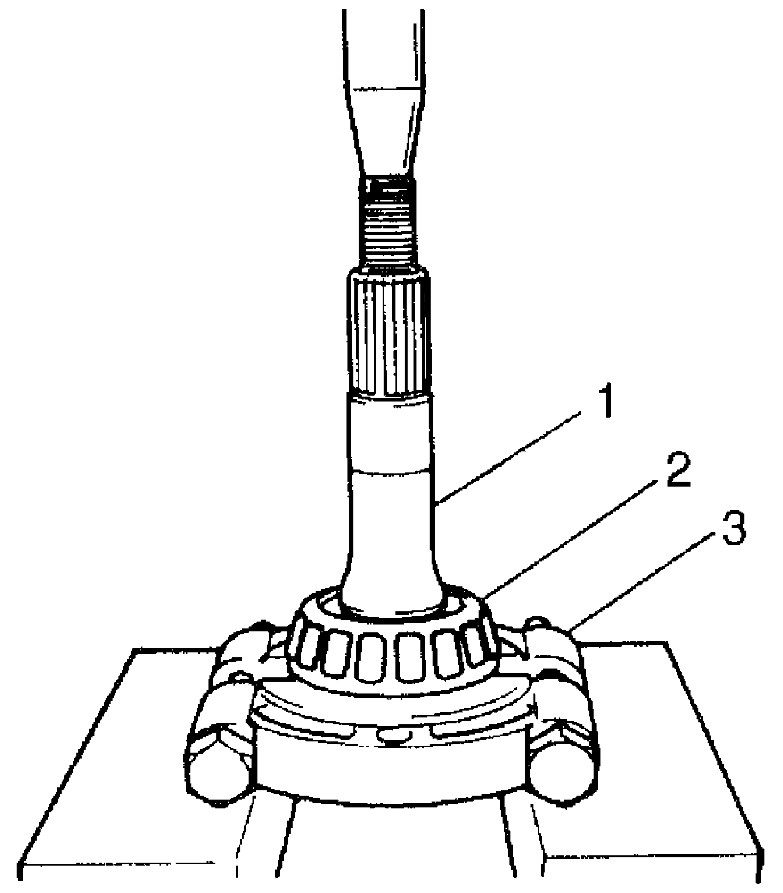 21) Use bearing puller (3) and hydraulic press to remove rear bearing (2) from bevel pinion (1).