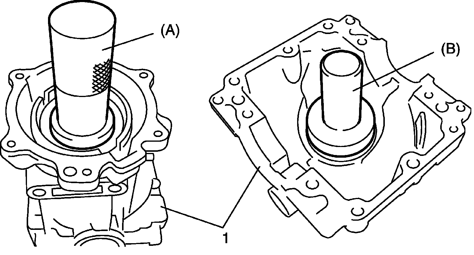 7) Use a special tool and plastic hammer as shown in figure to install oil seal into differential carrier (1).