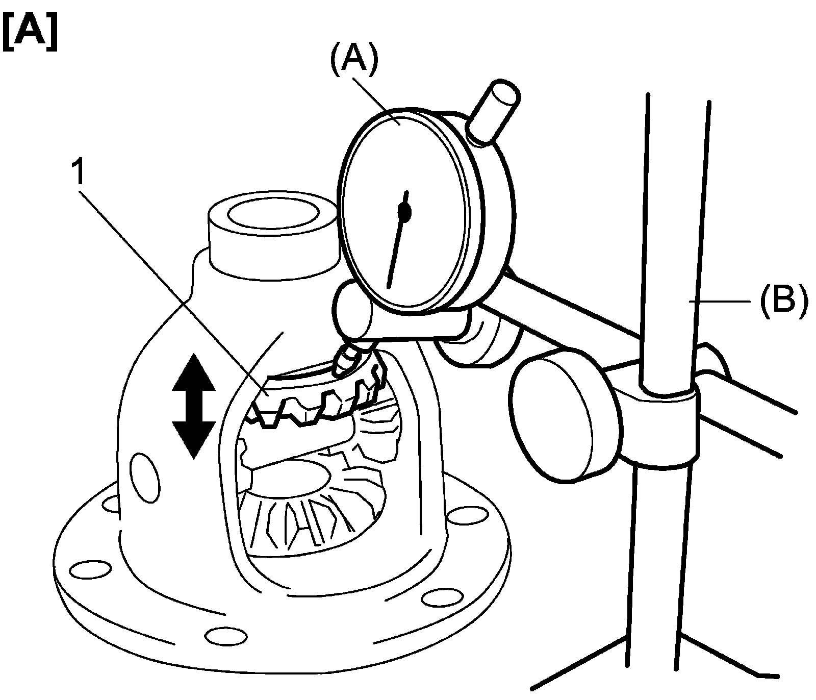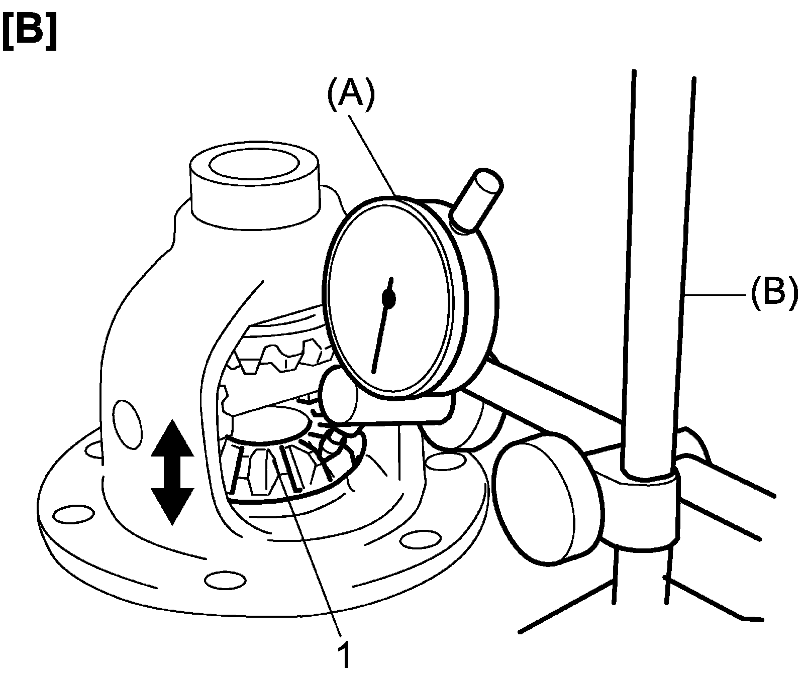 12) Measure differential gear (1) thrust play at upper side [A] and lower side [B]. If check result is not as specified, select suitable side washer, replace it and measure differential gear thrust play again.