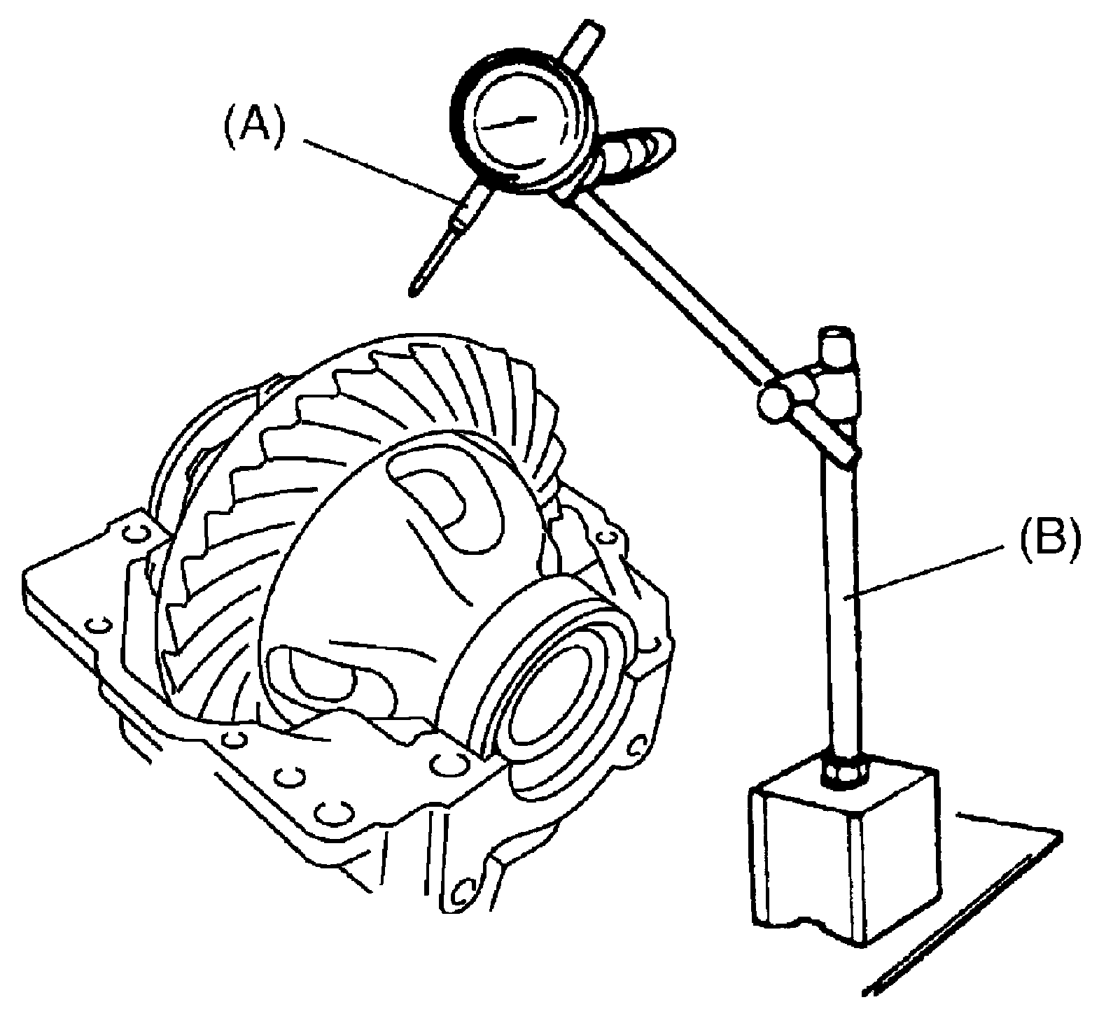 g) To measure bevel gear backlash, set dial gauge at right angle to bevel gear tooth, fix bevel pinion and read dial gauge while moving bevel gear. If bevel gear backlash is out of specification, adjust it by either changing thickness ratio or replacing parts.