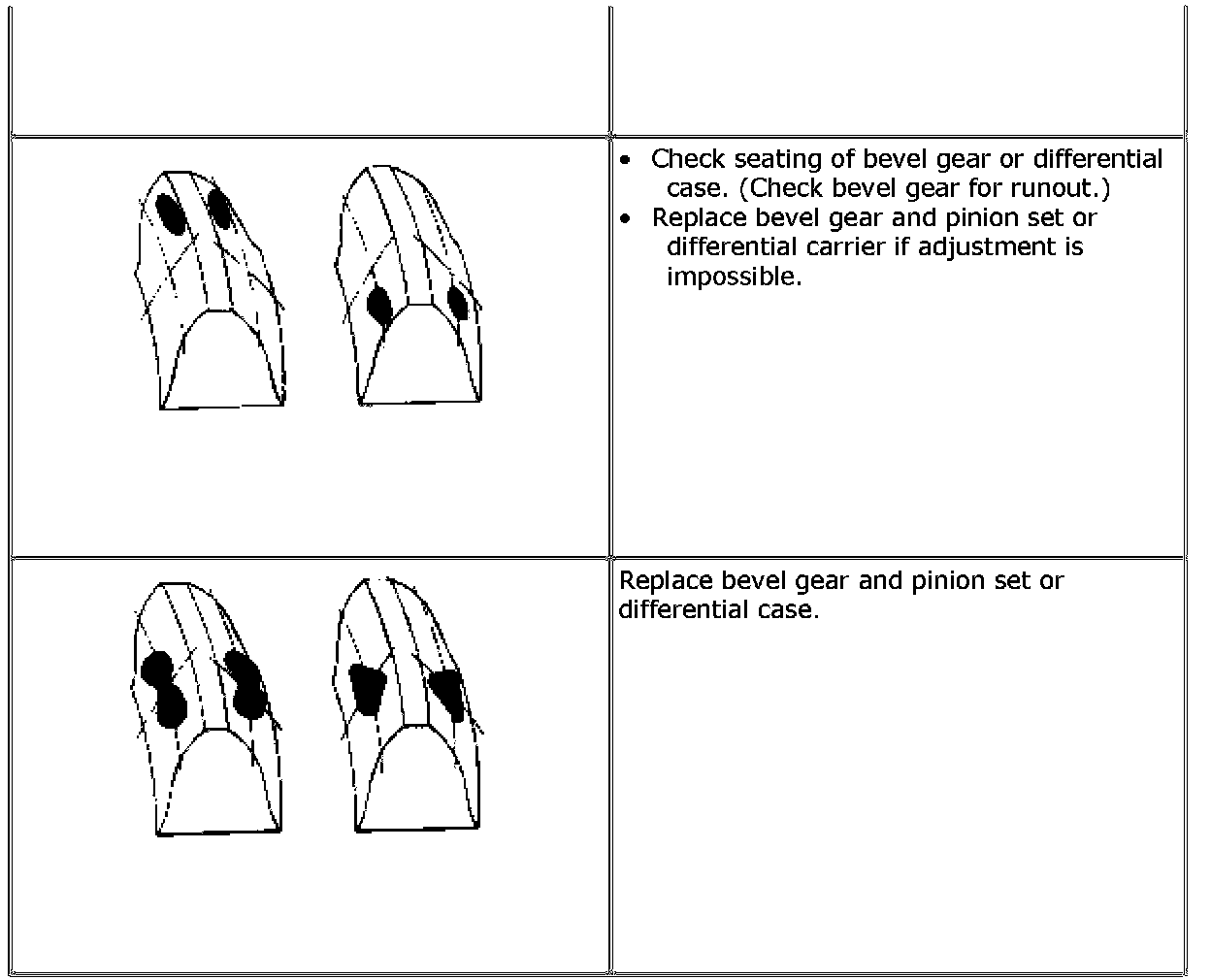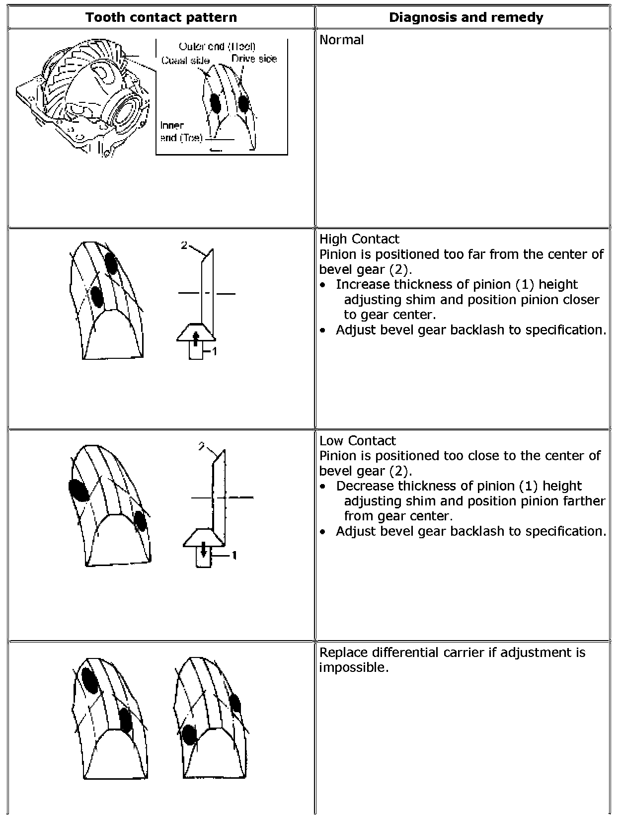 If bevel gear backlash and bevel pinion shims are adjusted properly, correct tooth contact should be provided. However, if correct tooth contact is not provided even when they are adjusted properly, there may be an abnormal condition in tooth, differential case or differential carrier. Check each component and replace if necessary.