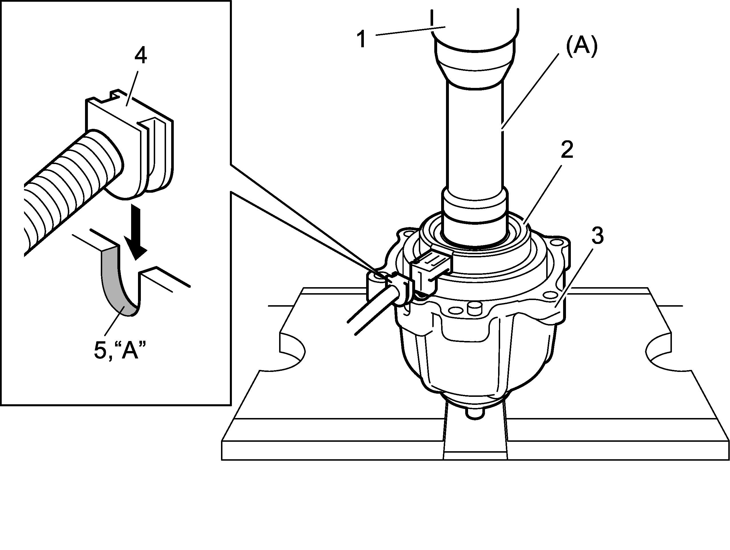 24) Install grommet (4) of coupling harness into groove (5) of coupling case (3), and then use special tool and hydraulic press (1) to install coupling assembly (2).