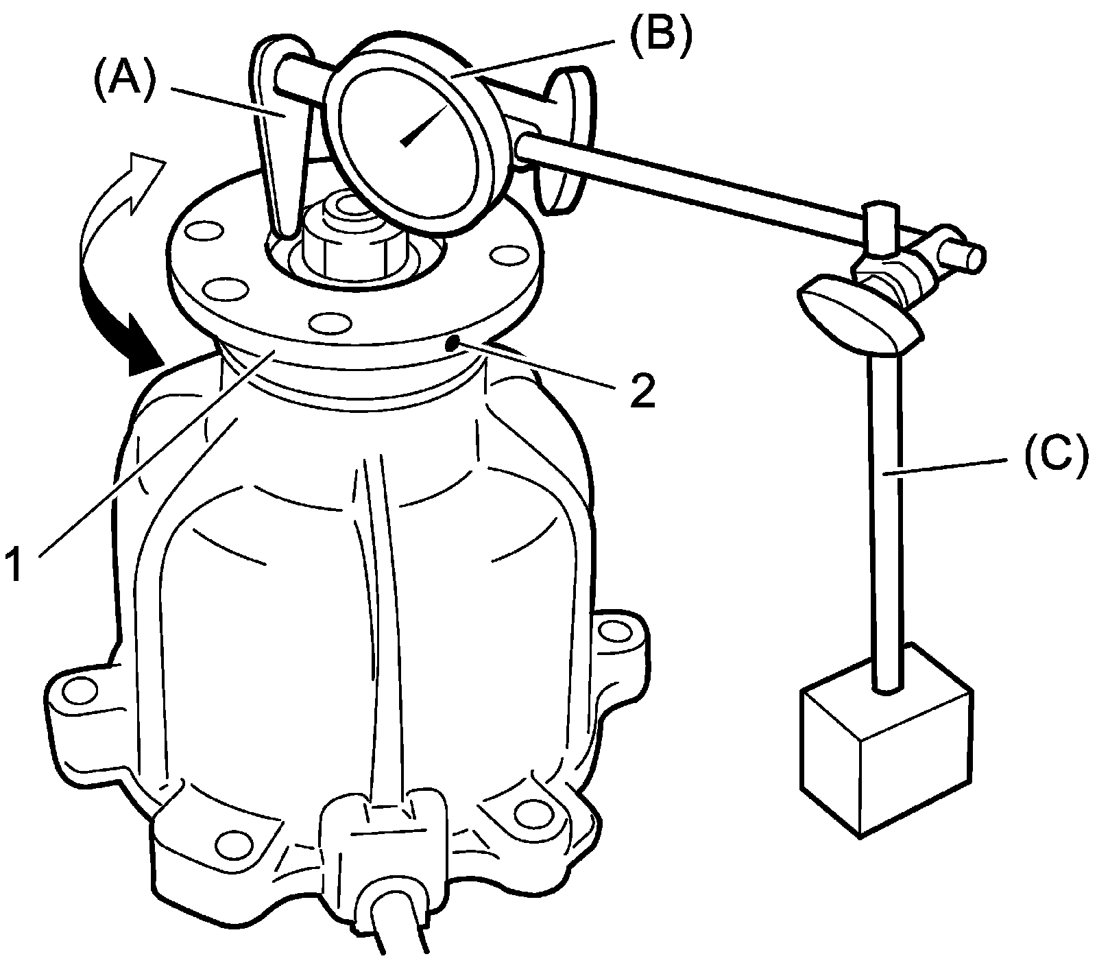 Mark (2) on companion flange outside diameter where runout is minimum value. If measurement exceeds runout limit, replace companion flange with new one and measure runout again.