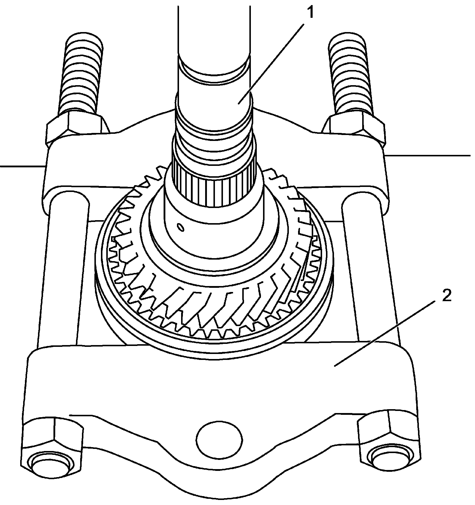 c) Remove 5th gear spacer (1) using puller (2) and hydraulic press.