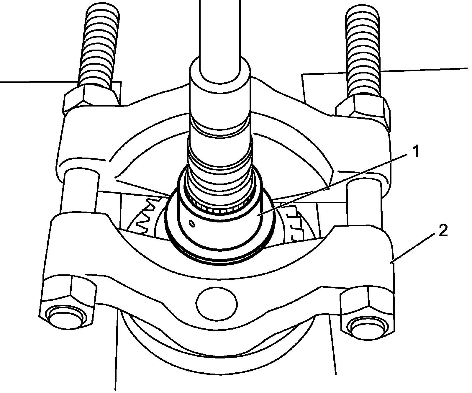 1) Install right bearing (1) to input shaft (2) using special tool and hydraulic press.