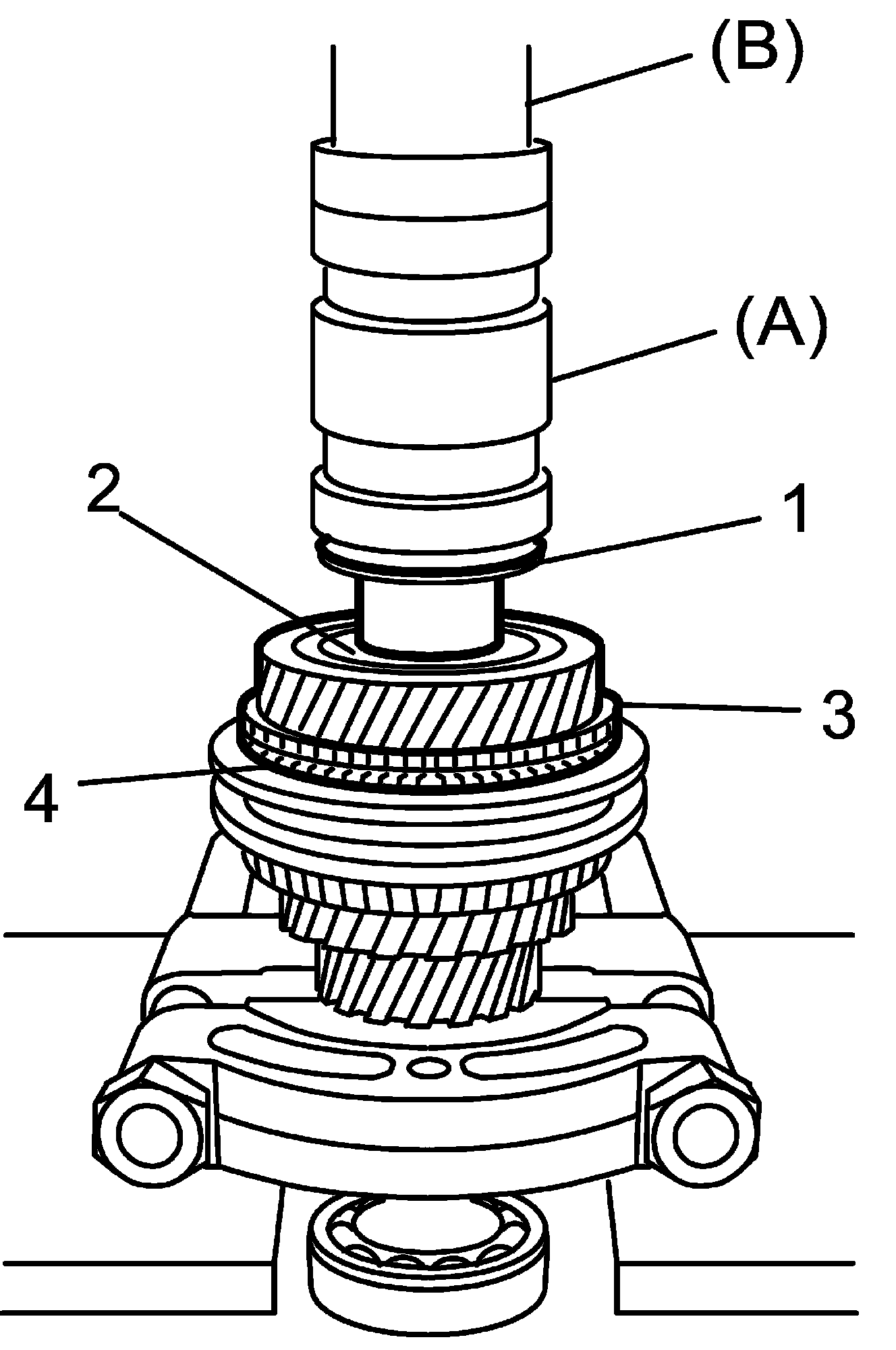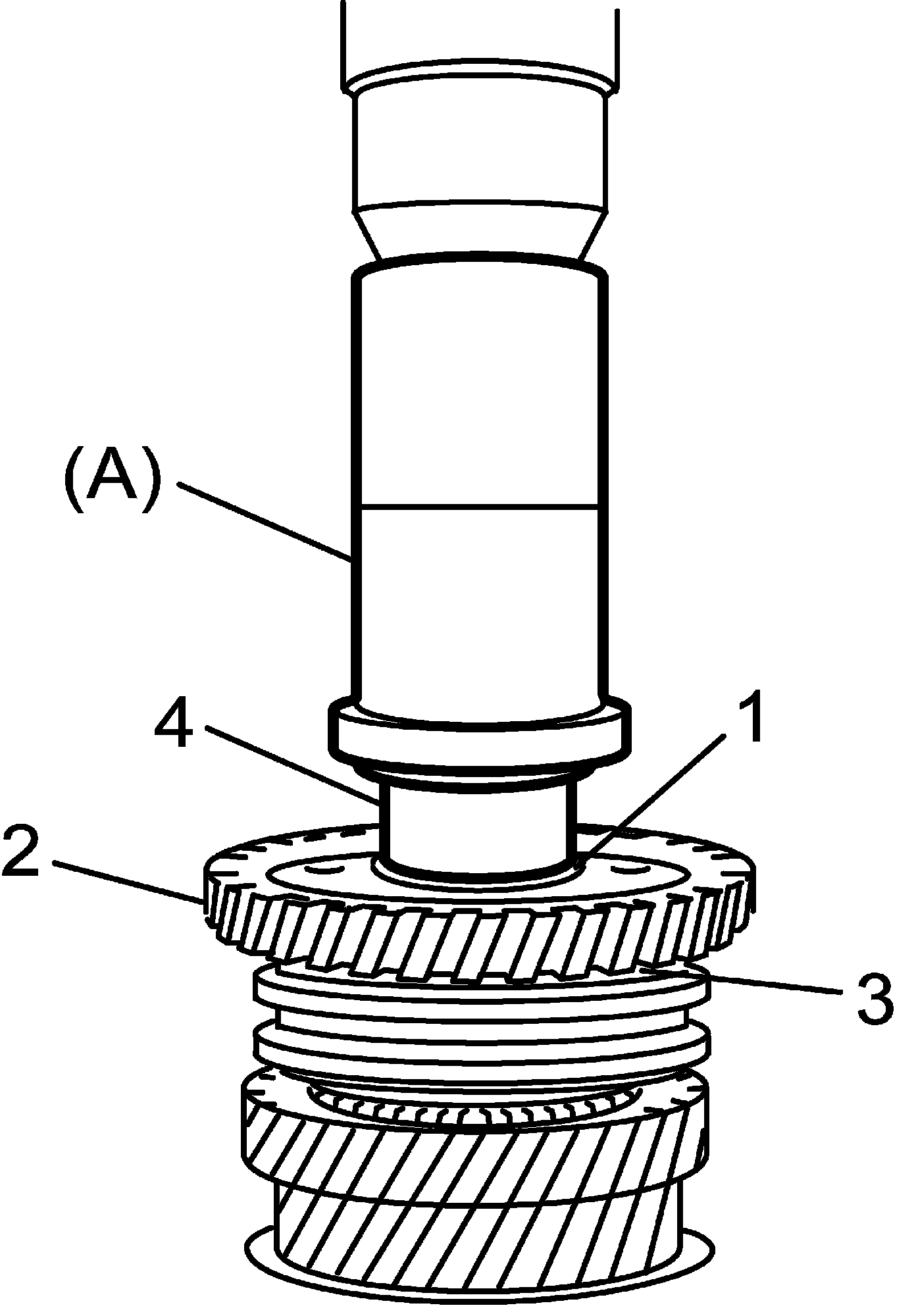 5) Install 4th gear needle bearing (2) and apply transaxle oil to it, and then install synchronizer ring (4) and 4th gear (3).