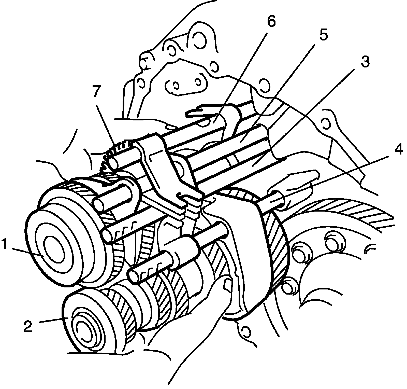 5) Tapping input shaft end with plastic hammer, push it out as assembly from case a little, and then remove input shaft assembly (1), countershaft assembly (2), high speed gear shift shaft (3), low speed gear shift shaft (4), 5th and 6th gear shift shaft (5), reverse gear shift (6) and reverse gears (7).
