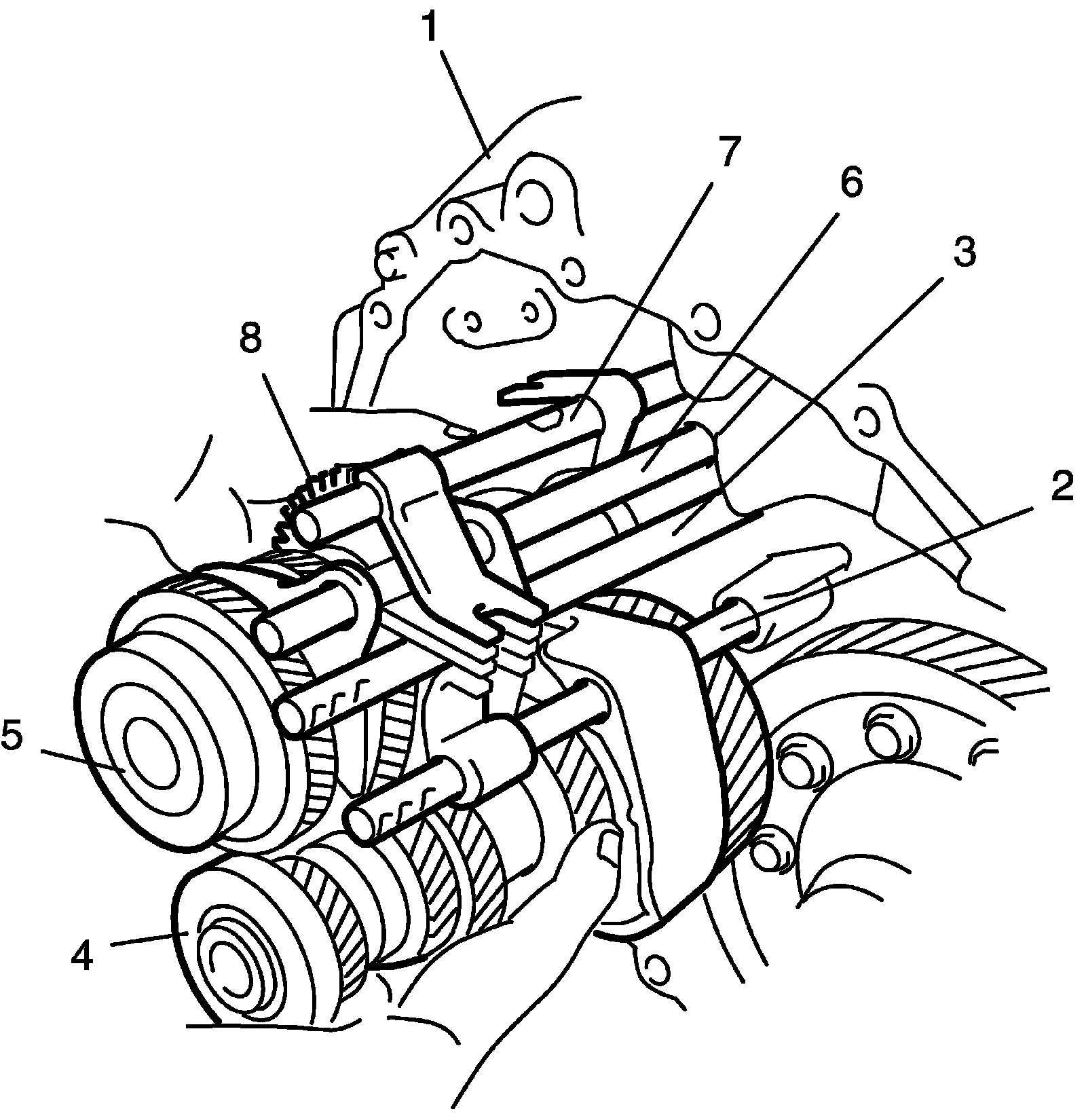 2) Join input shaft assembly (5), countershaft assembly (4), low speed gear shift shaft (2), high speed gear shift shaft (3), 5th and 6th gear shift shaft (6), reverse gear shift shaft (7) and reverse gears (8) all together, then install them into right case (1) so as not to damage oil seal by input shaft spline.