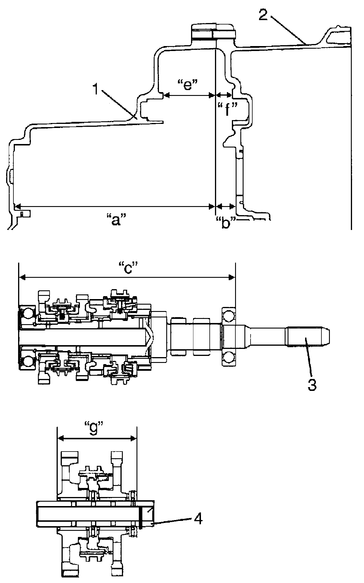 b) Measure distance "c" of input shaft assembly (3) and measure distance "g" of reverse gear assembly (4).