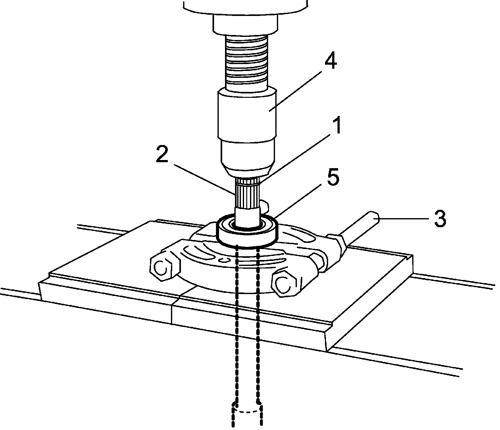 4) Remove intermediate shaft bearing (5) from intermediate shaft by using bearing puller (3) and hydraulic press (4).