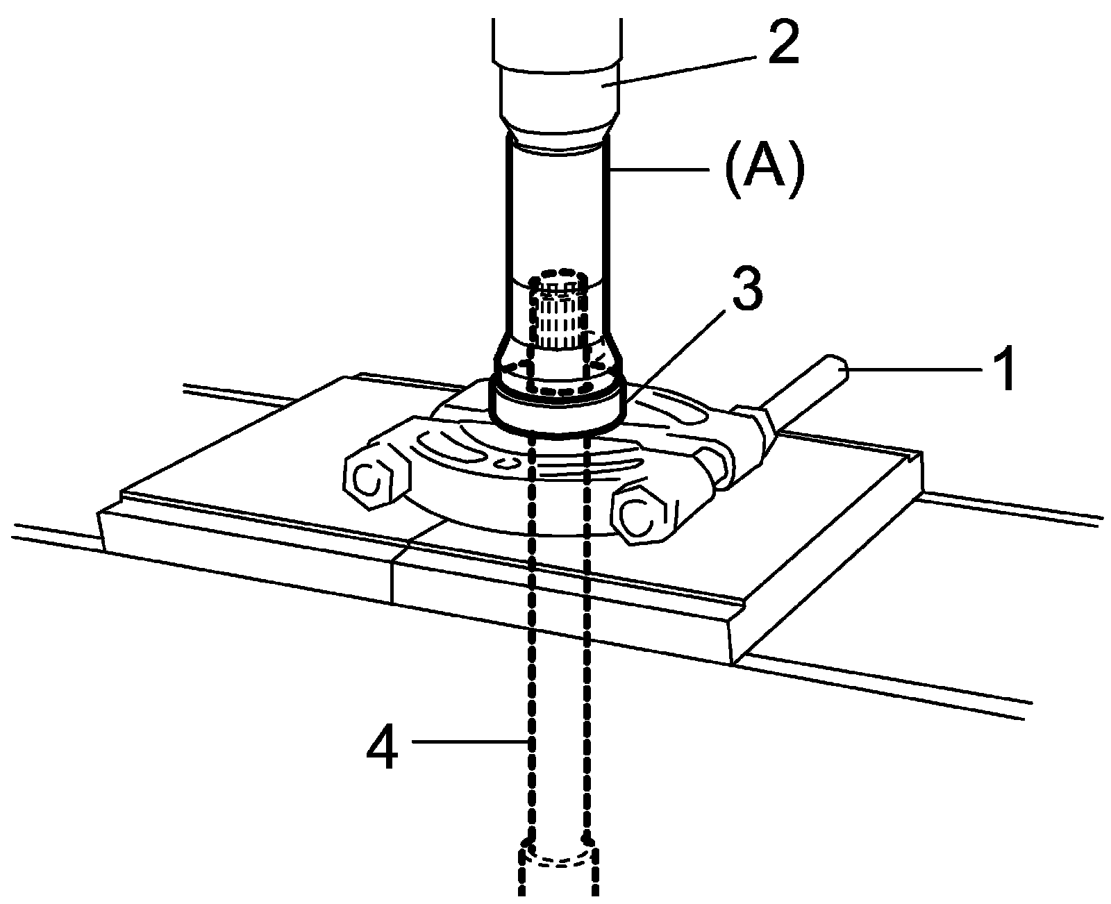 1) Install intermediate shaft bearing (3) to intermediate shaft (4) by using special tool, bearing puller (1) and hydraulic press (2).