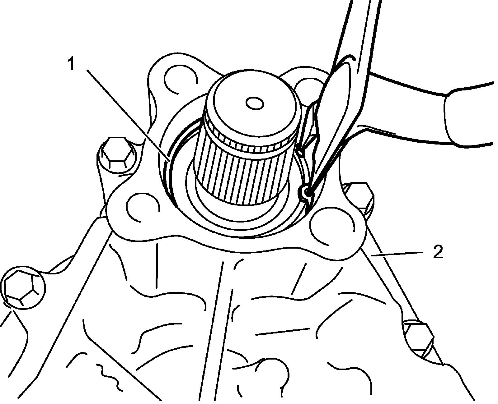 2) Install new circlip (1) to intermediate shaft (2).