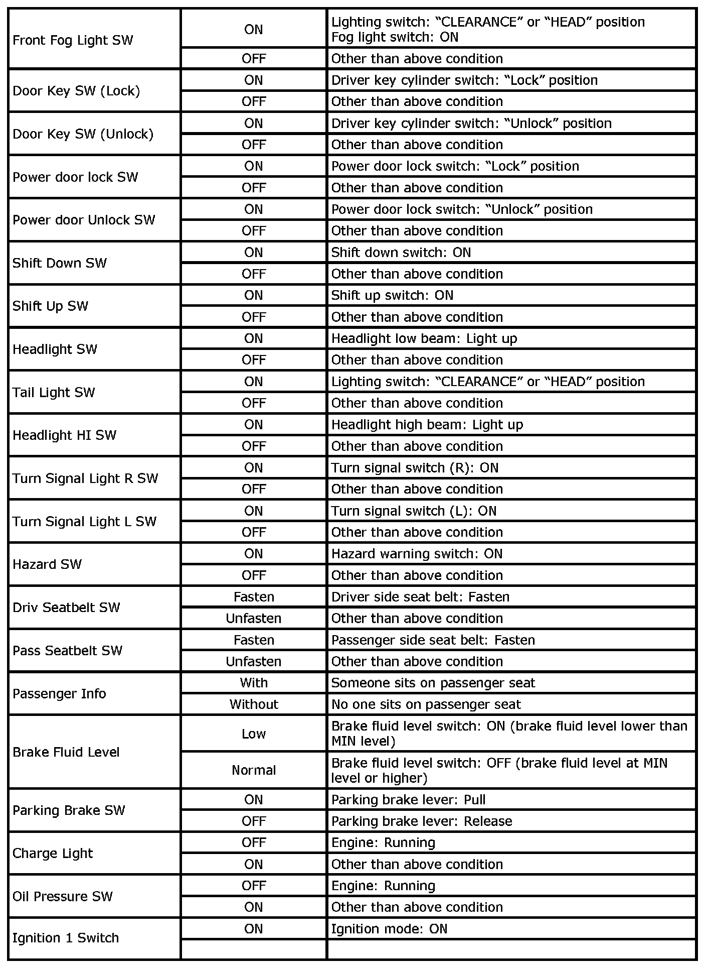 - For "Ignition mode" described in the following table, it means power supply mode in keyless push start system.