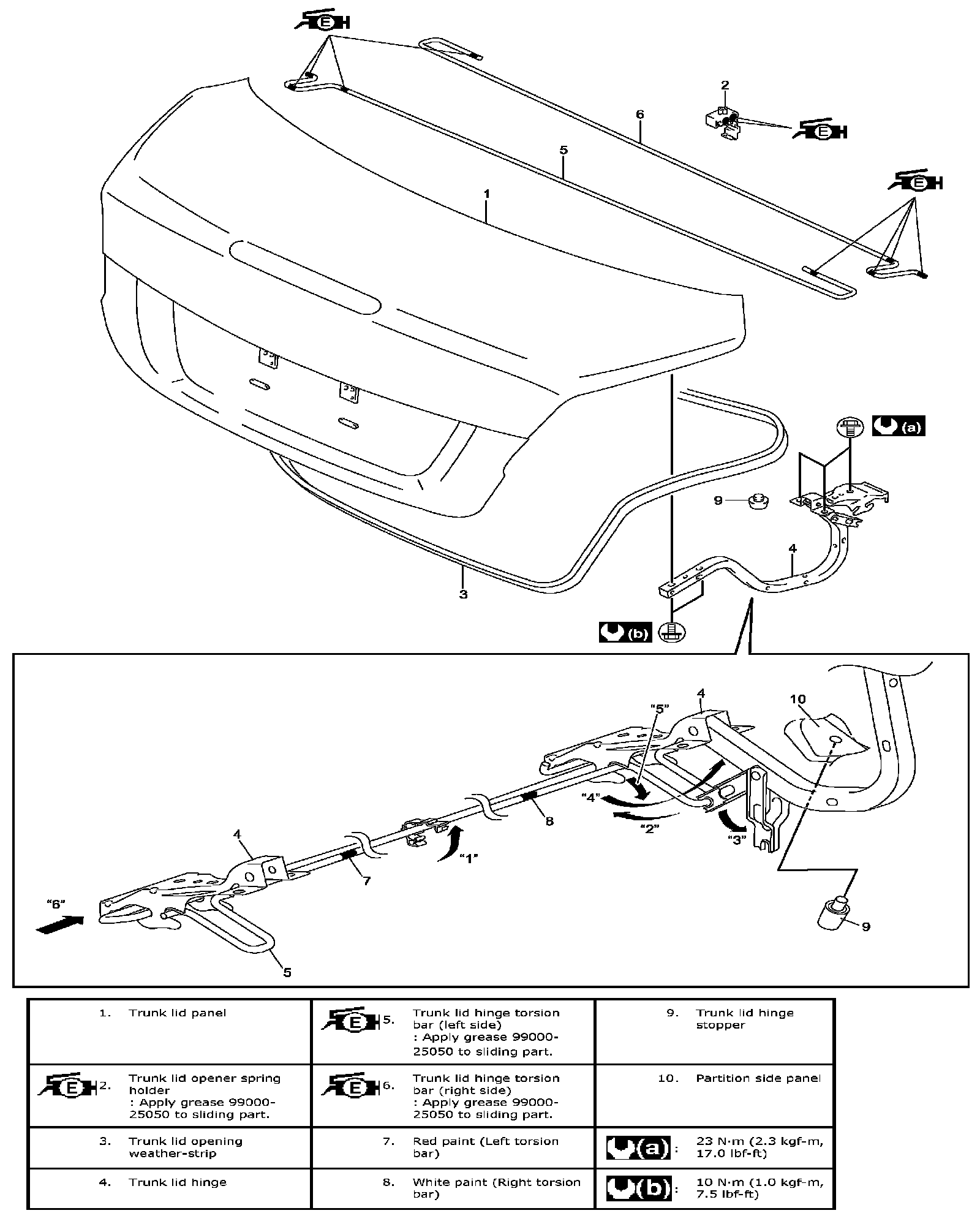 - Remove trunk lid opener spring holder (2) "1". Remove right torsion bar by moving it in arrow directions in order of "2" to "6", and then remove left torsion bar in the same procedure (but symmetrically opposite). (To install the torsion bars, reverse removal procedure.)