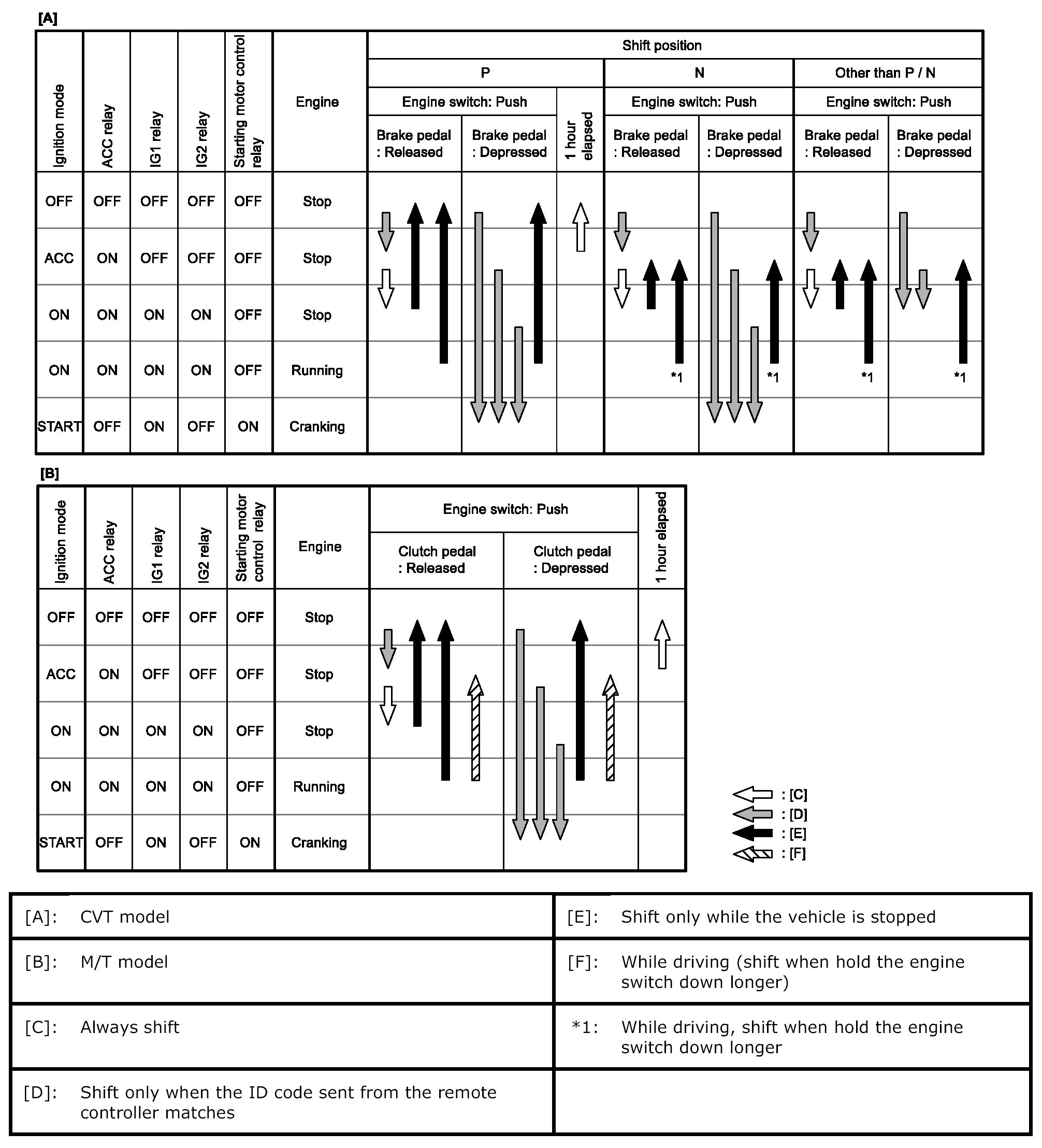- Table below shows transition of ignition mode according to engine switch operation. One arrow indicates transition by pressing engine switch once.