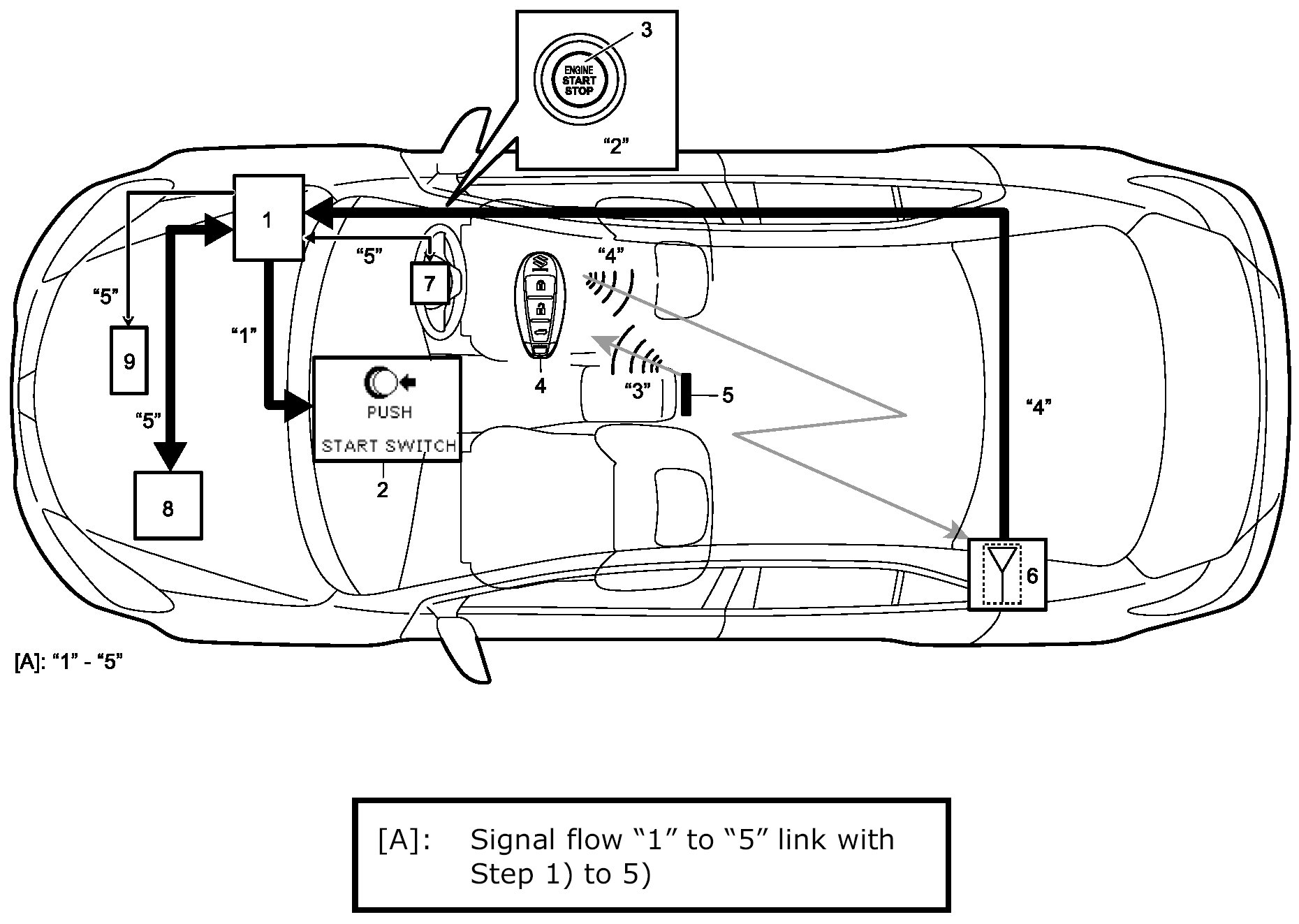 3. Keyless start control module activates mid inside antenna (5) to send request signal to remote controller.