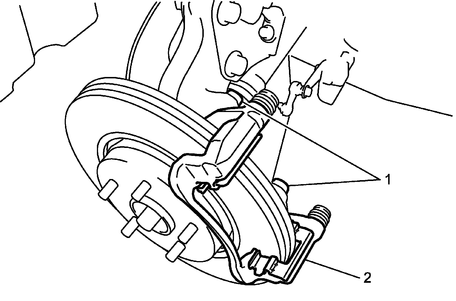 3) Remove front brake caliper carrier bolts (1) and remove front brake caliper carrier (2) from steering knuckle.