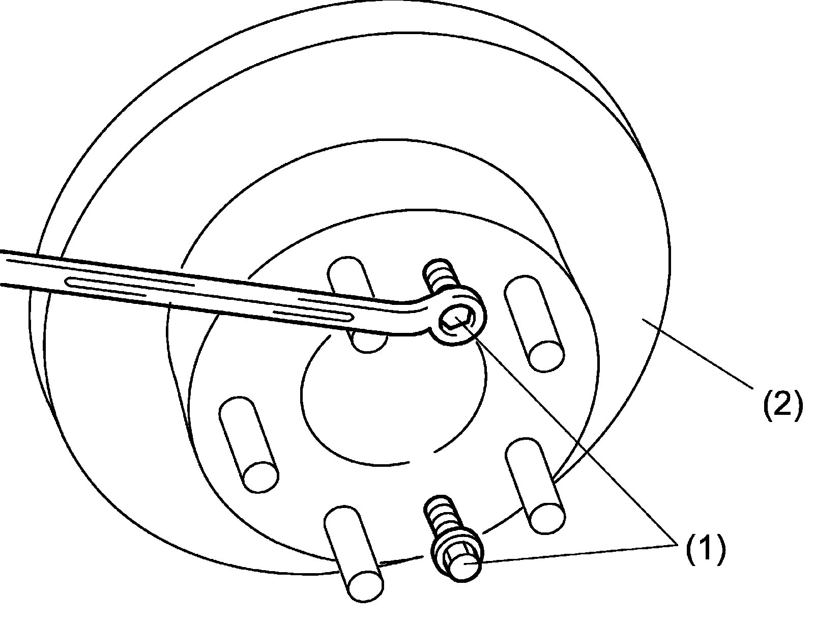 4) Push out brake disc (2) by tightening two M8 bolts (1) evenly into jack bolt holes.