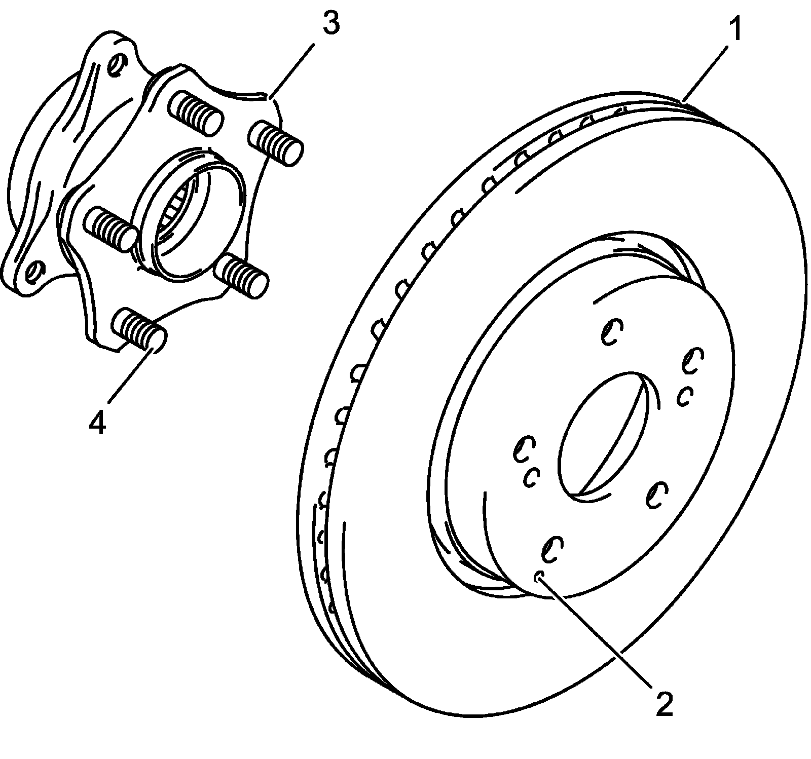 1) Align paint (2) on brake disc (1) with paint (4) on front wheel hub (3) and install brake disc.