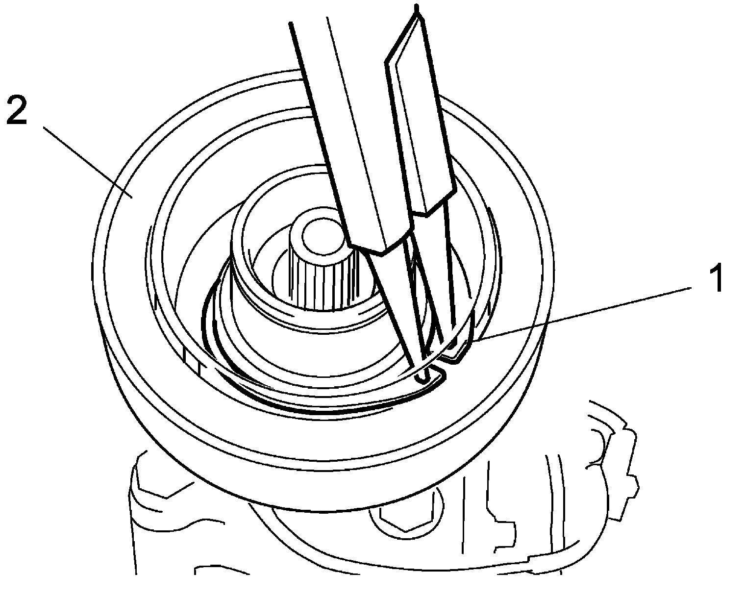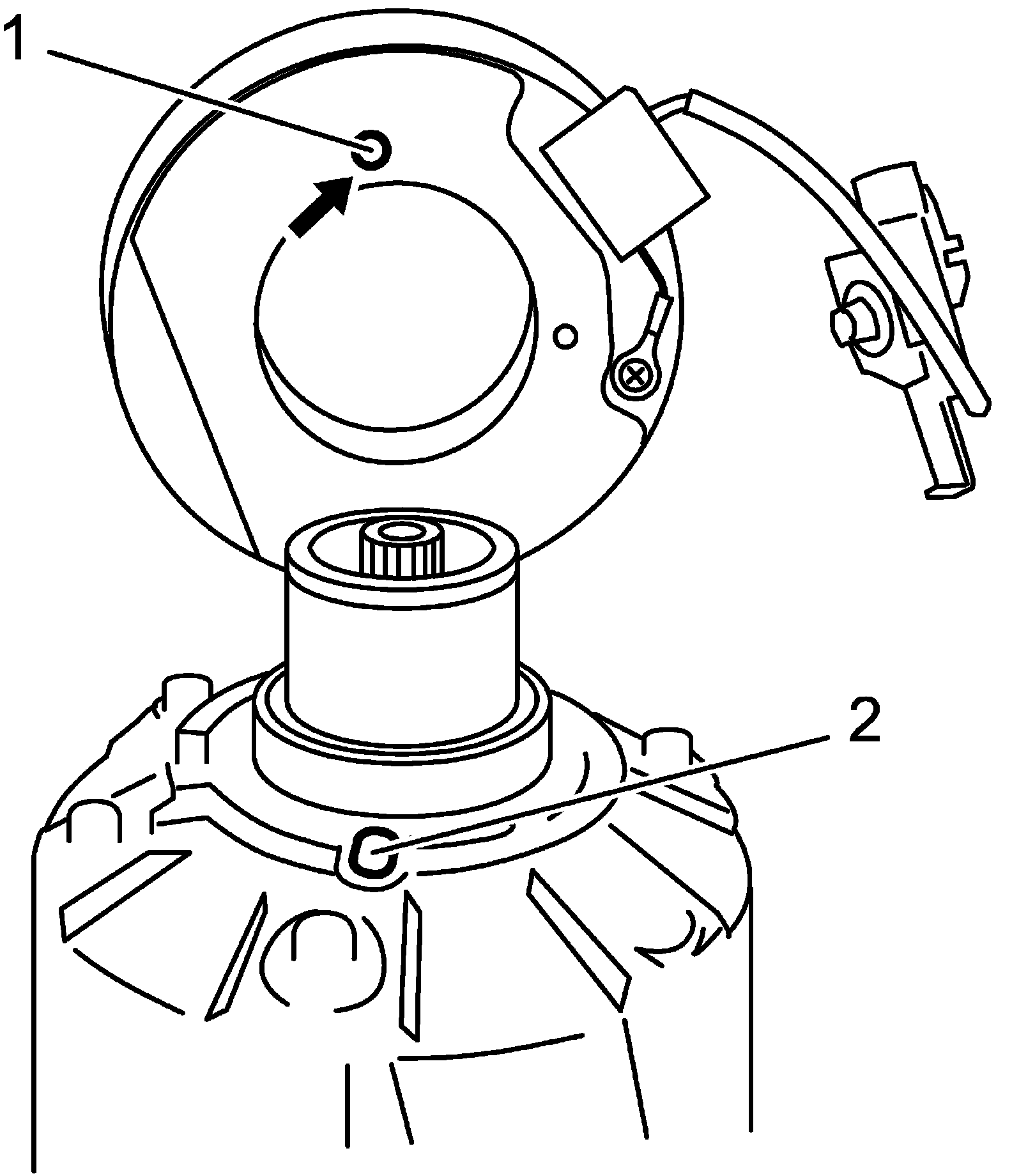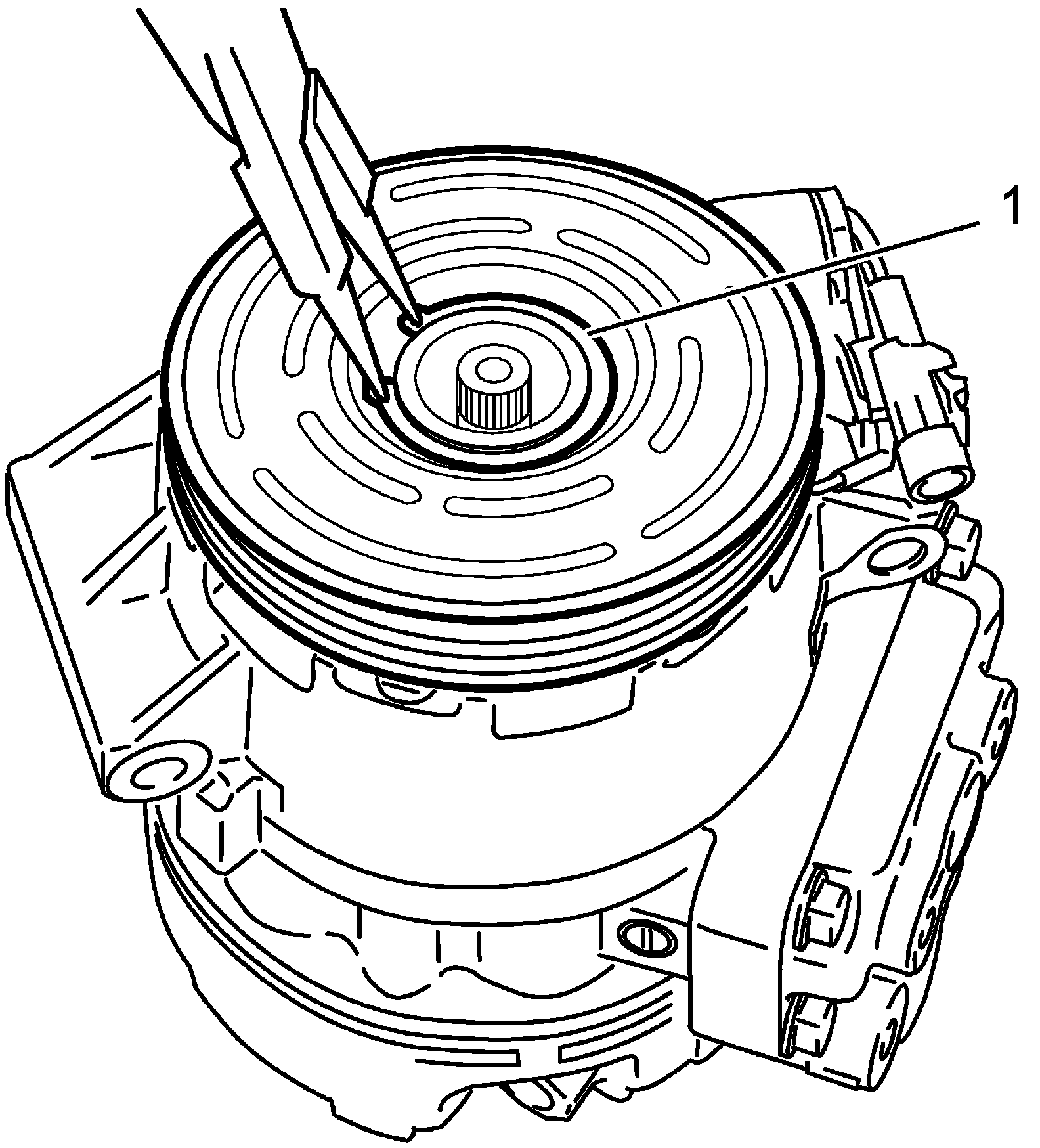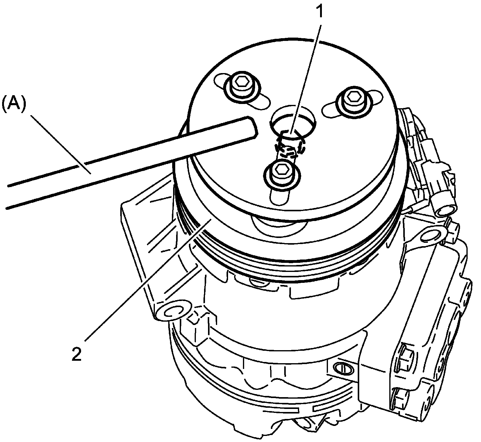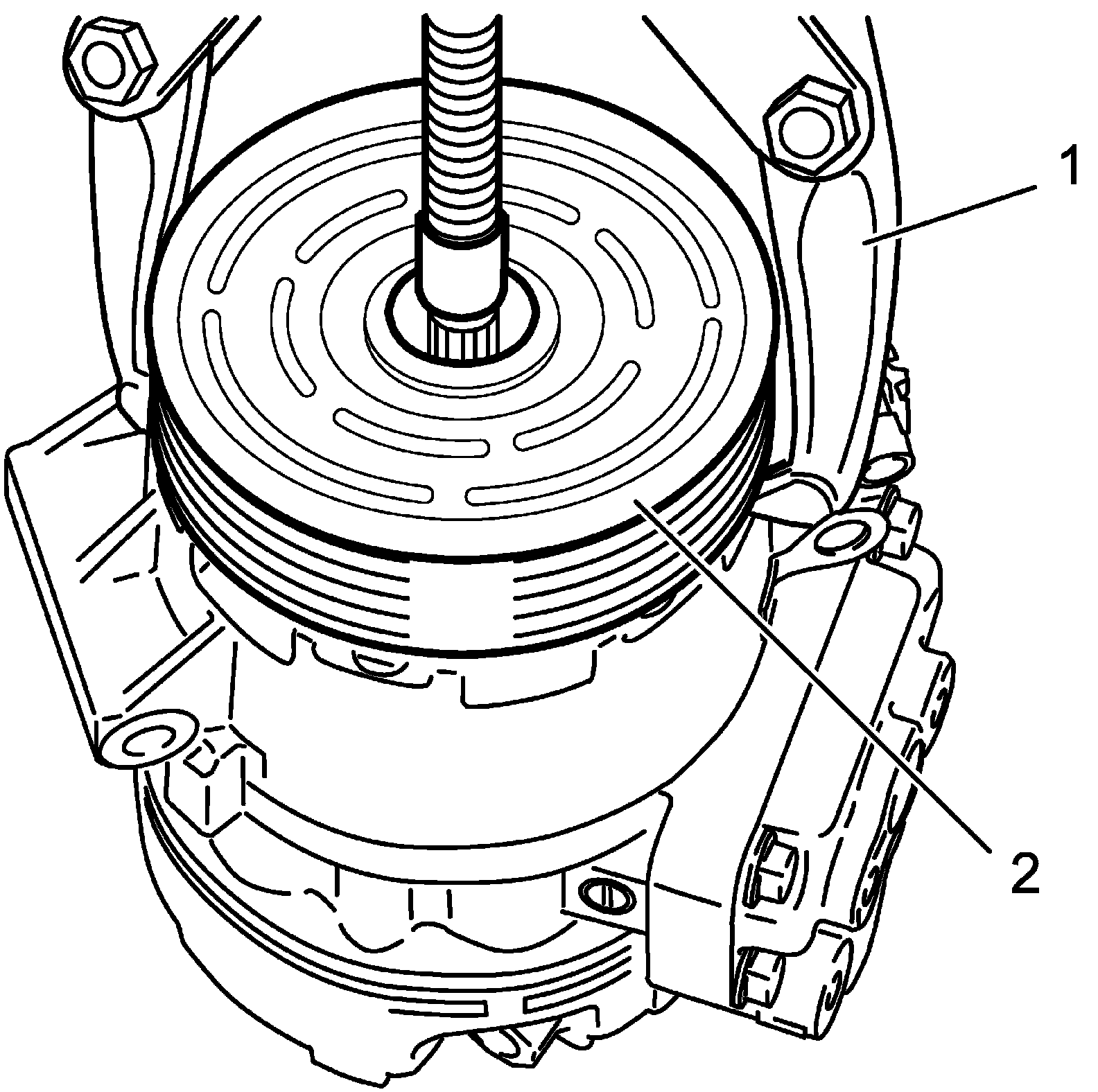 - Fit protrusion (1) on underside of magnet clutch coil into hole (2) on A/C compressor body assembly.