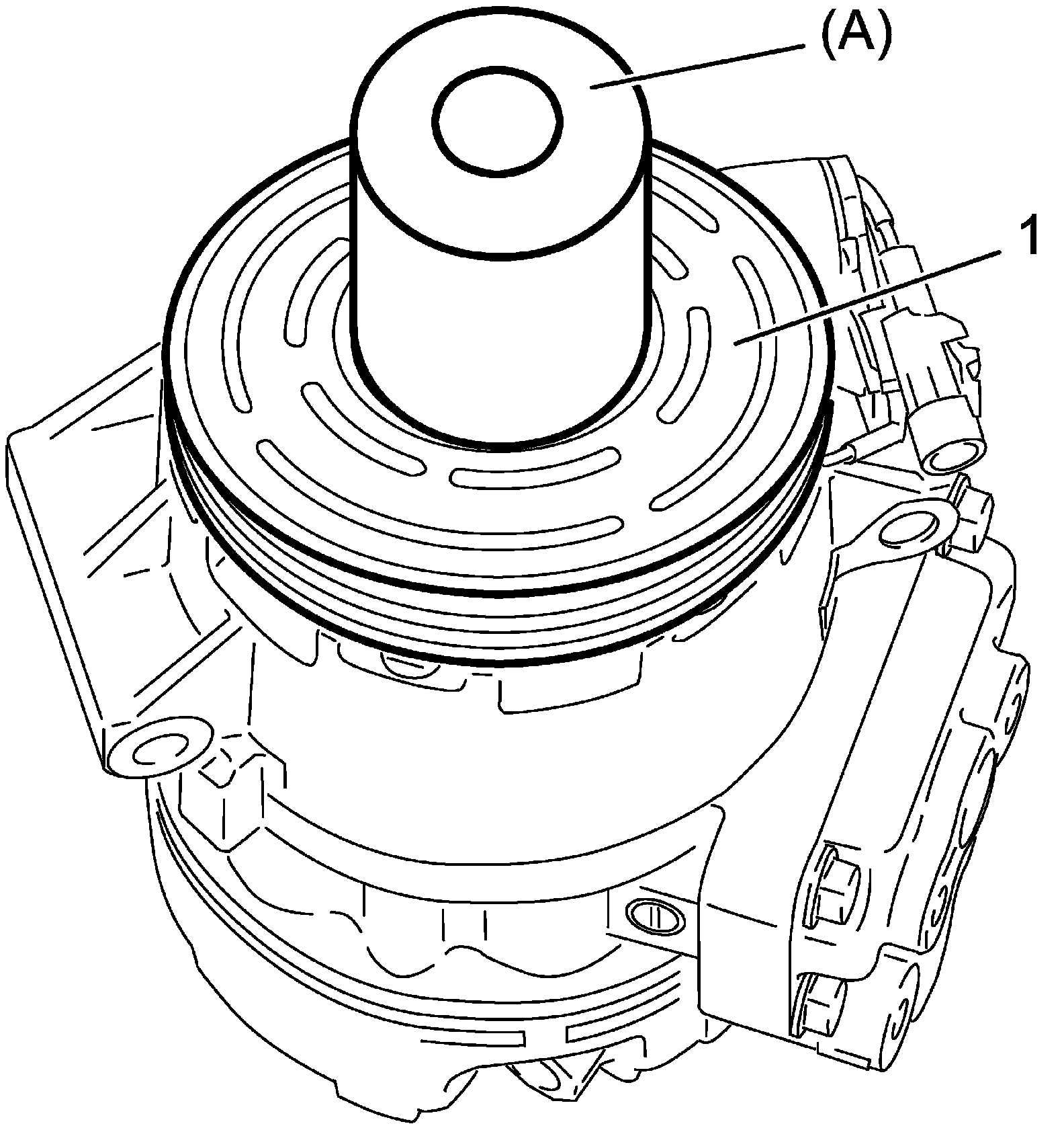 - Press fit magnet clutch pulley (1) by using special tool and hydraulic press.