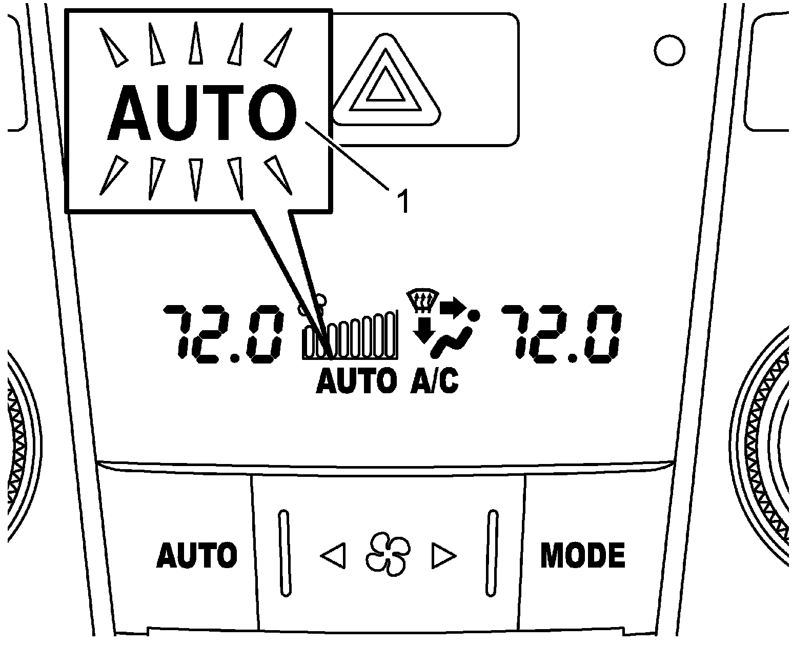 When HVAC control module detects malfunction, the "AUTO" display (1) flashes to warn and the diagnostic trouble code (DTC) is stored in the memory of the module. When diagnosing trouble, the DTC can be checked with DTC Check DTC Check.