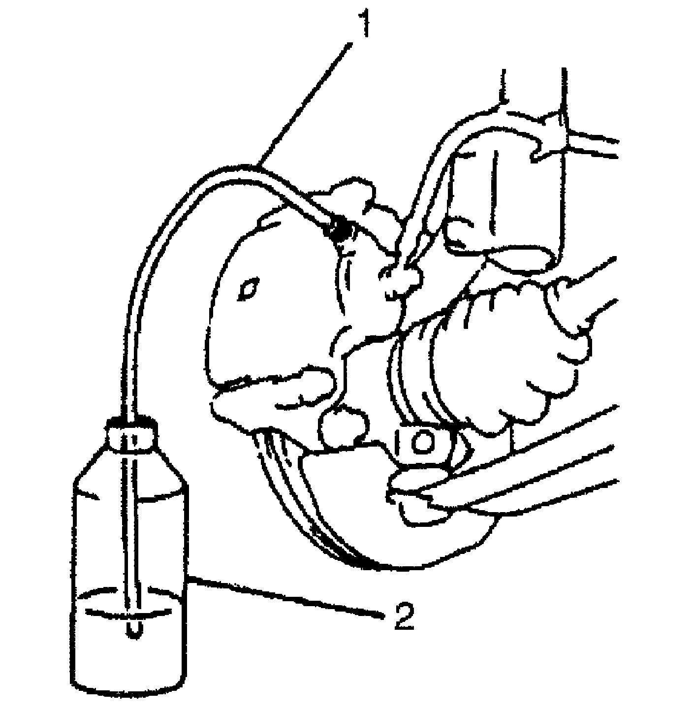 2) Remove bleeder plug cap. Attach a vinyl tube (1) to bleeder plug, and insert the other end into container (2).