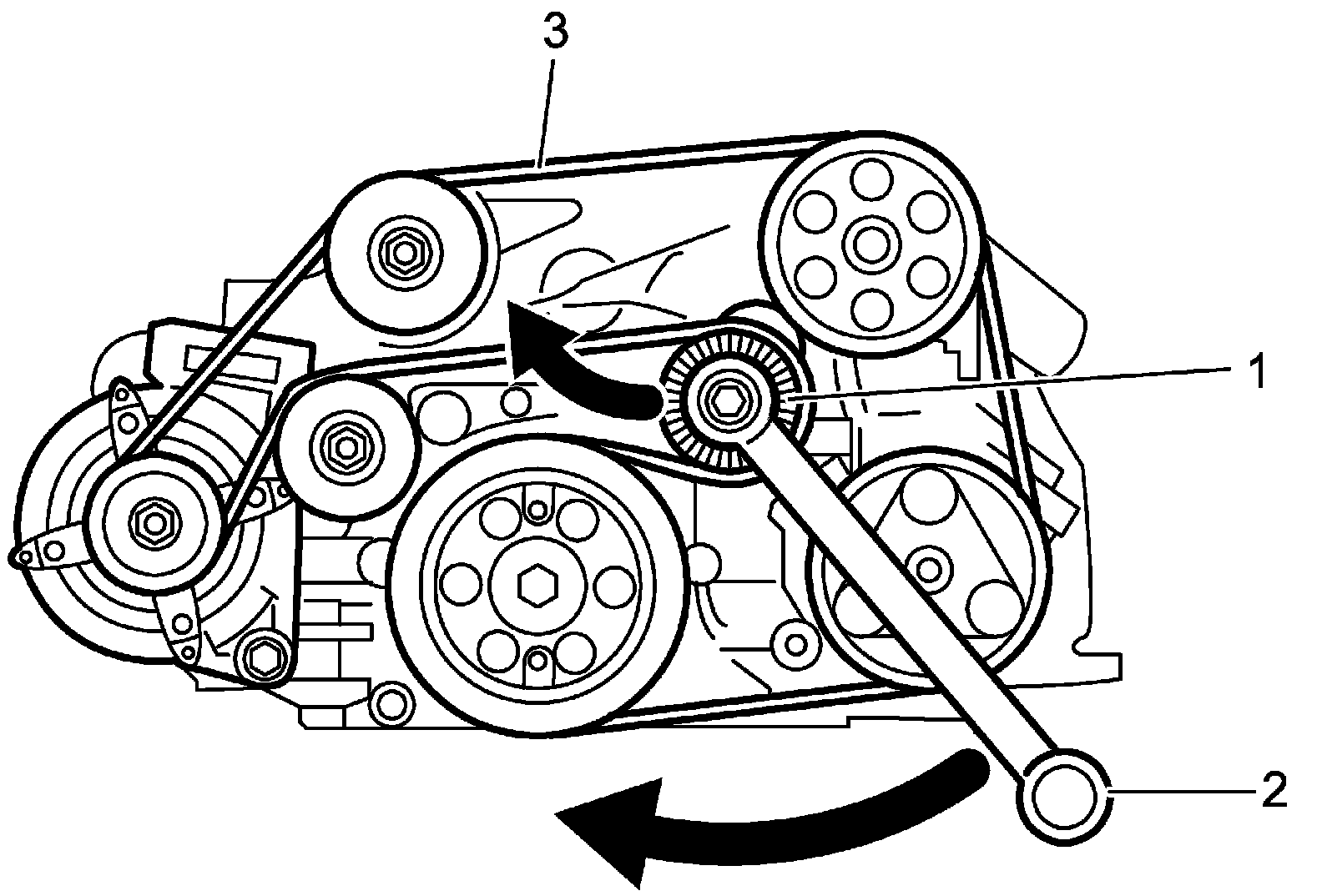 1. Loosen belt tension by turning tensioner (1) in clockwise direction using wrench (2). After loosening, install accessory drive belt (3).