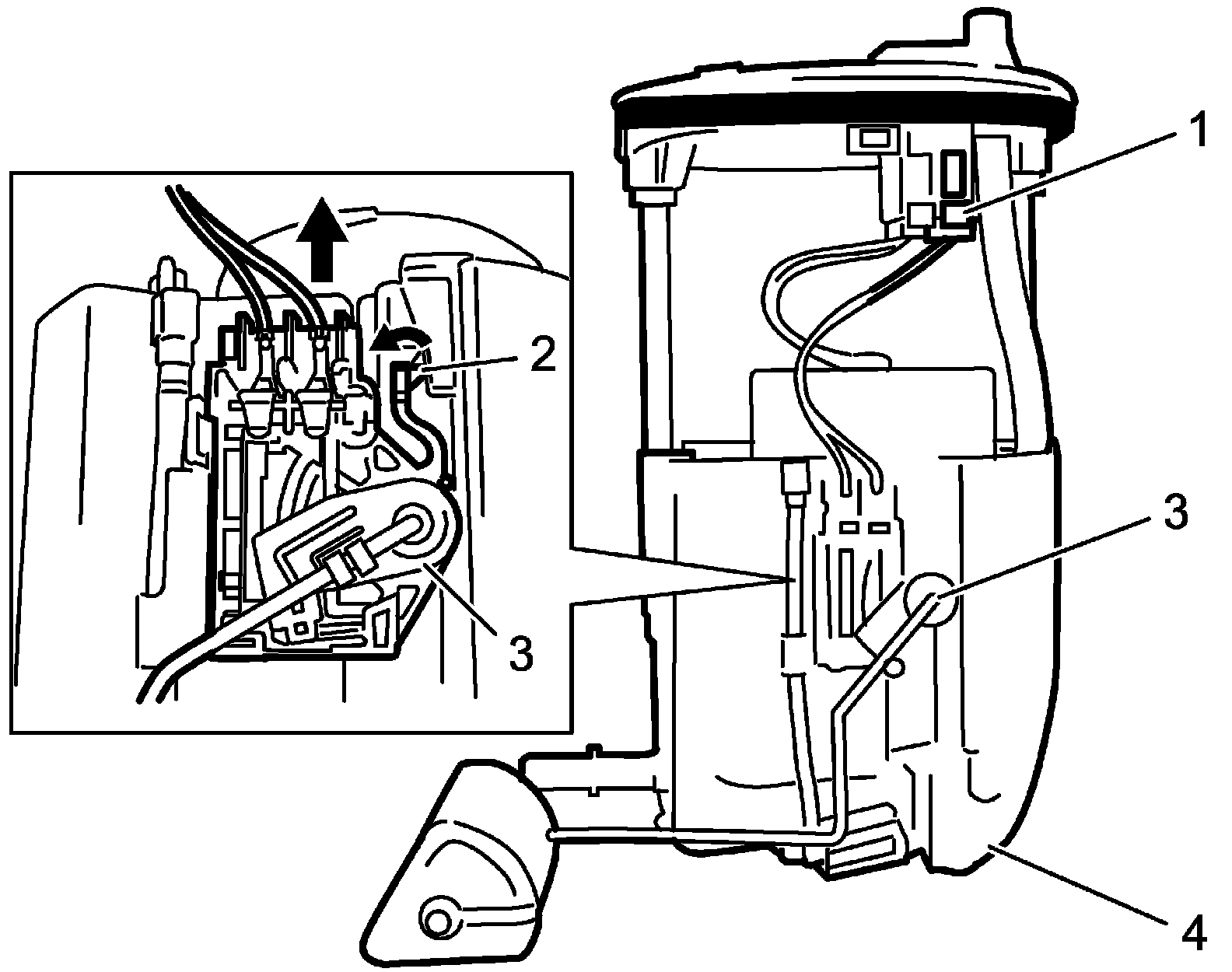 3. Release lock (2), remove fuel level sensor (3) from fuel pump (4) by sliding it in arrow direction as shown in figure.