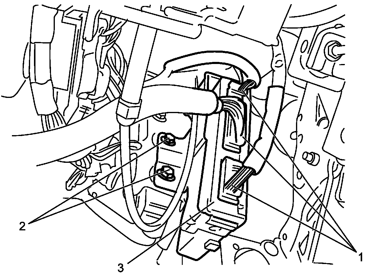 3. Disconnect keyless start control module connectors (1) and harness clamp.