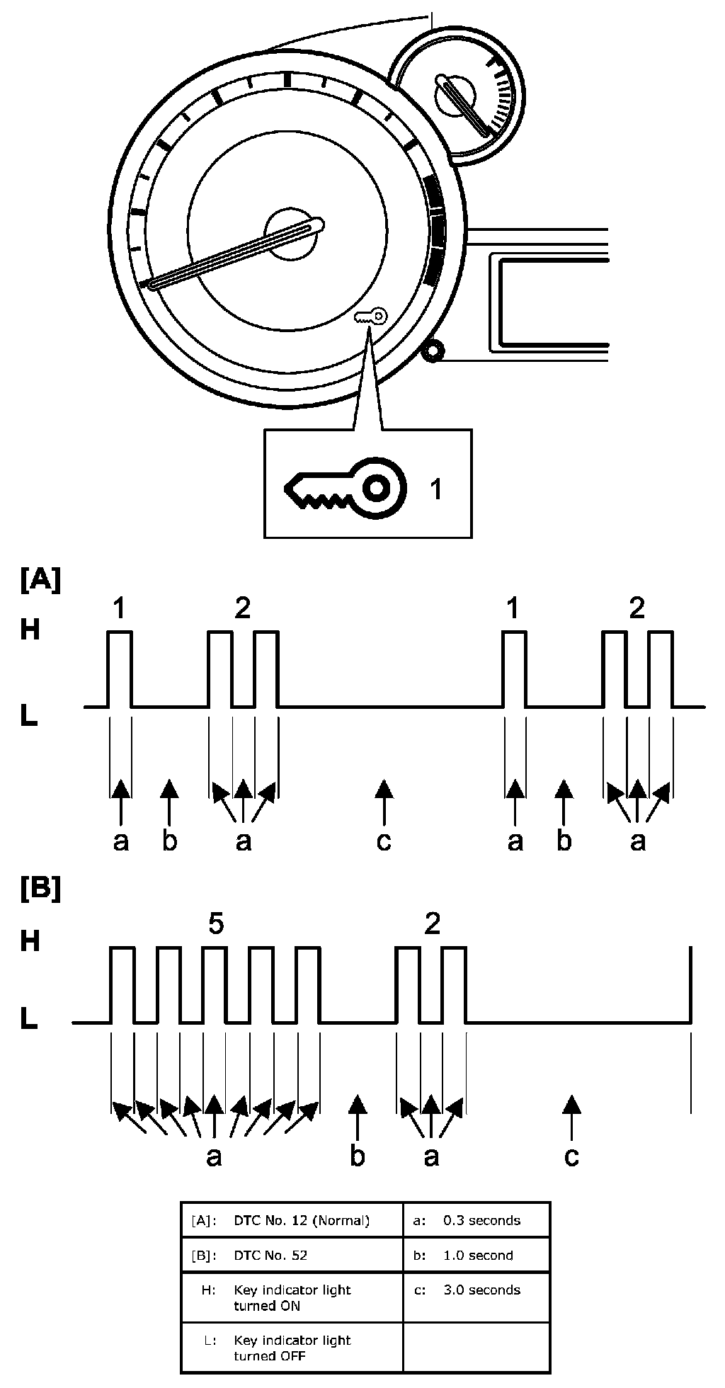 6. Read flashing pattern of key indicator light (1) which represents DTC as shown in example below and write it down. When more than 2 DTCs are stored in memory, flashing for each DTC is repeated three times starting with the smallest DTC number in increasing order.