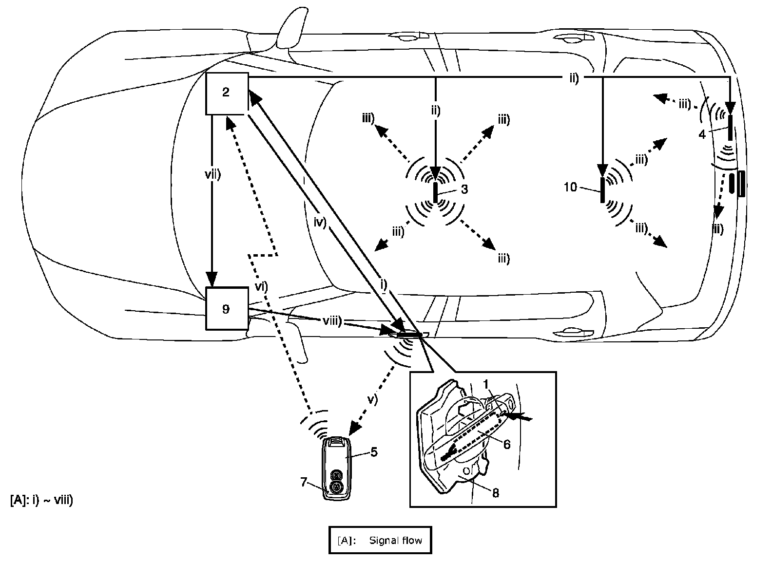The keyless start control module compares the ID code sent from the remote controller with the ID code registered in the keyless start control module. If both ID codes match, the keyless start control module outputs the lock or unlock request signal (depending on the door lock switch (8) state then) to BCM (9). When BCM receives such signal through CAN communication from the keyless start control module, it activates the door lock actuator to lock or unlock doors.