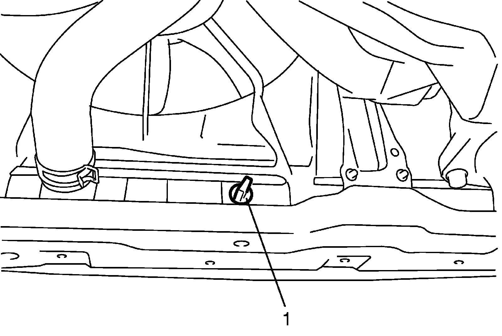 3) Stop engine and drain coolant from radiator drain plug (1).