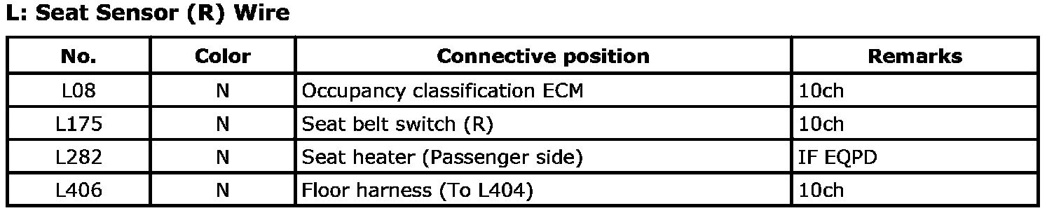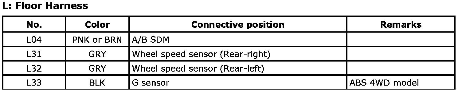 Floor L: Floor Harness, Coupling Harness, Seat Sensor (R) Wire, Seat Sensor (L) Wire / Q: Side Curtain-Air Bag Wire, Side-Air Bag (Driver Side) Harness, Side-Air Bag (Passenger Side) Harness / R: Fuel Pump Wire (Hatchback Model)L: Floor Harness, Coupling Harnes, Seat Sensor (R) Wire, Seat Sensor (L) Wire / Q: Side Curtain-Air Bag Wire, Side-Air Bag (Driver Side) Harness, Side-Air Bag (Passenger Side) Harness / R: Fuel Pump Wire (Hatchback Model):