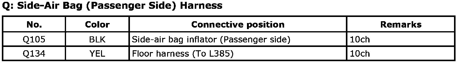 FloorL: Floor Harness, Coupling Harness, Seat Sensor (R) Wire, Seat Sensor (L) Wire / Q: Side Curtain-Air Bag Wire, Side-Air Bag (Driver Side) Harness, Side-Air Bag (Passenger Side) Harness / R: Fuel Pump Wire (Hatchback Model)L: Floor Harness, Coupling Harnes, Seat Sensor (R) Wire, Seat Sensor (L) Wire / Q: Side Curtain-Air Bag Wire, Side-Air Bag (Driver Side) Harness, Side-Air Bag (Passenger Side) Harness / R: Fuel Pump Wire (Hatchback Model):