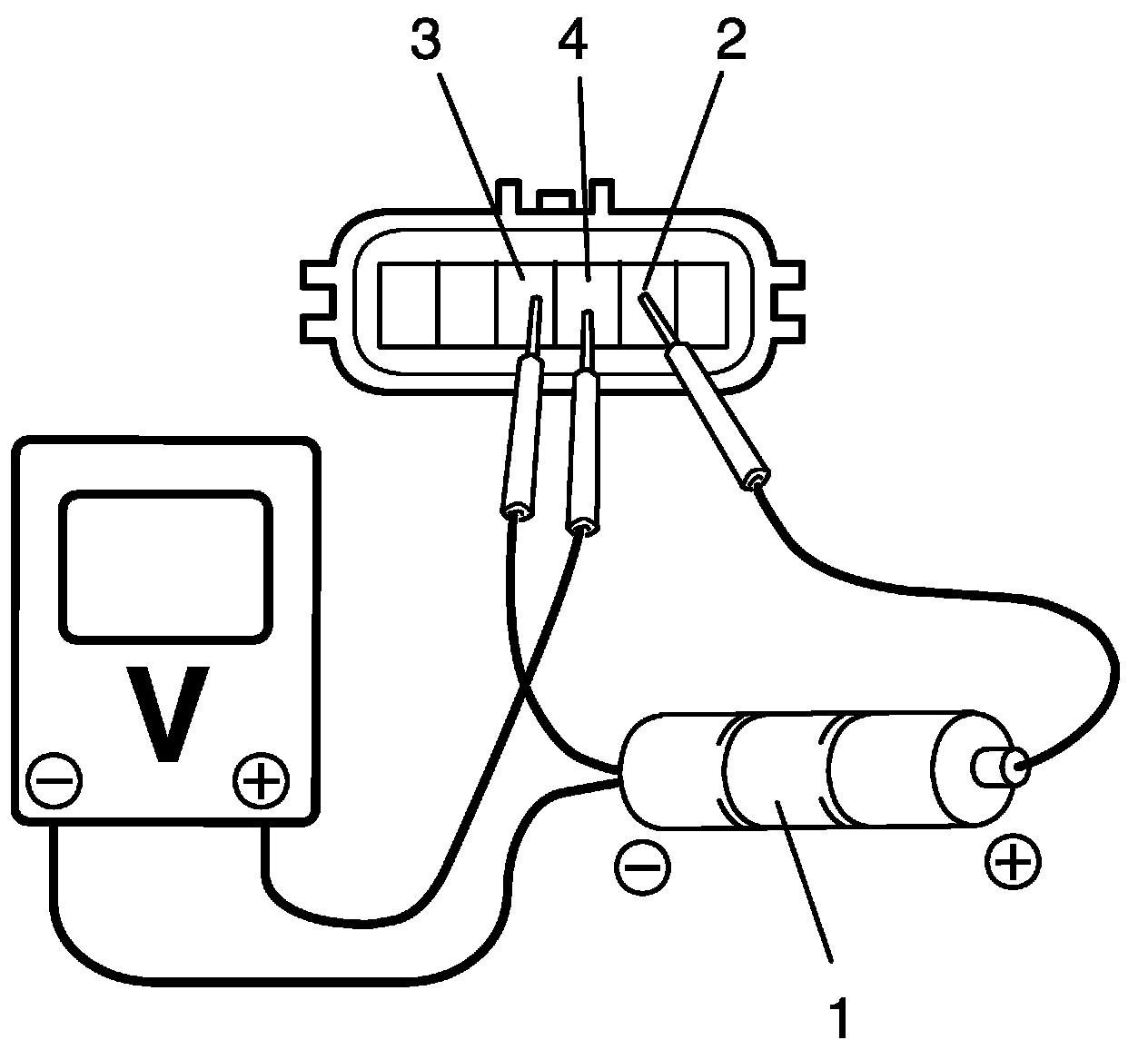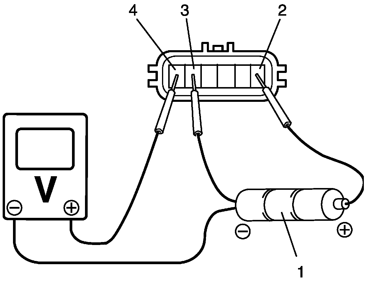 1. For APP sensor (main), arrange 3 new 1.5 V batteries (1) in series (check that total voltage is 4.5 - 5.0 V) and connect its positive terminal to "Vin 1" terminal (2) and negative terminal to "Ground 1" terminal (3) of sensor. Then using voltmeter, connect positive terminal to "Vout 1" terminal (4) of sensor and negative terminal to battery.