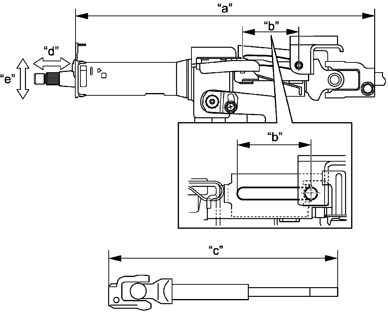 ^ Check that there is no axial looseness "d" and no axially-vertical looseness "e" for steering column shaft.