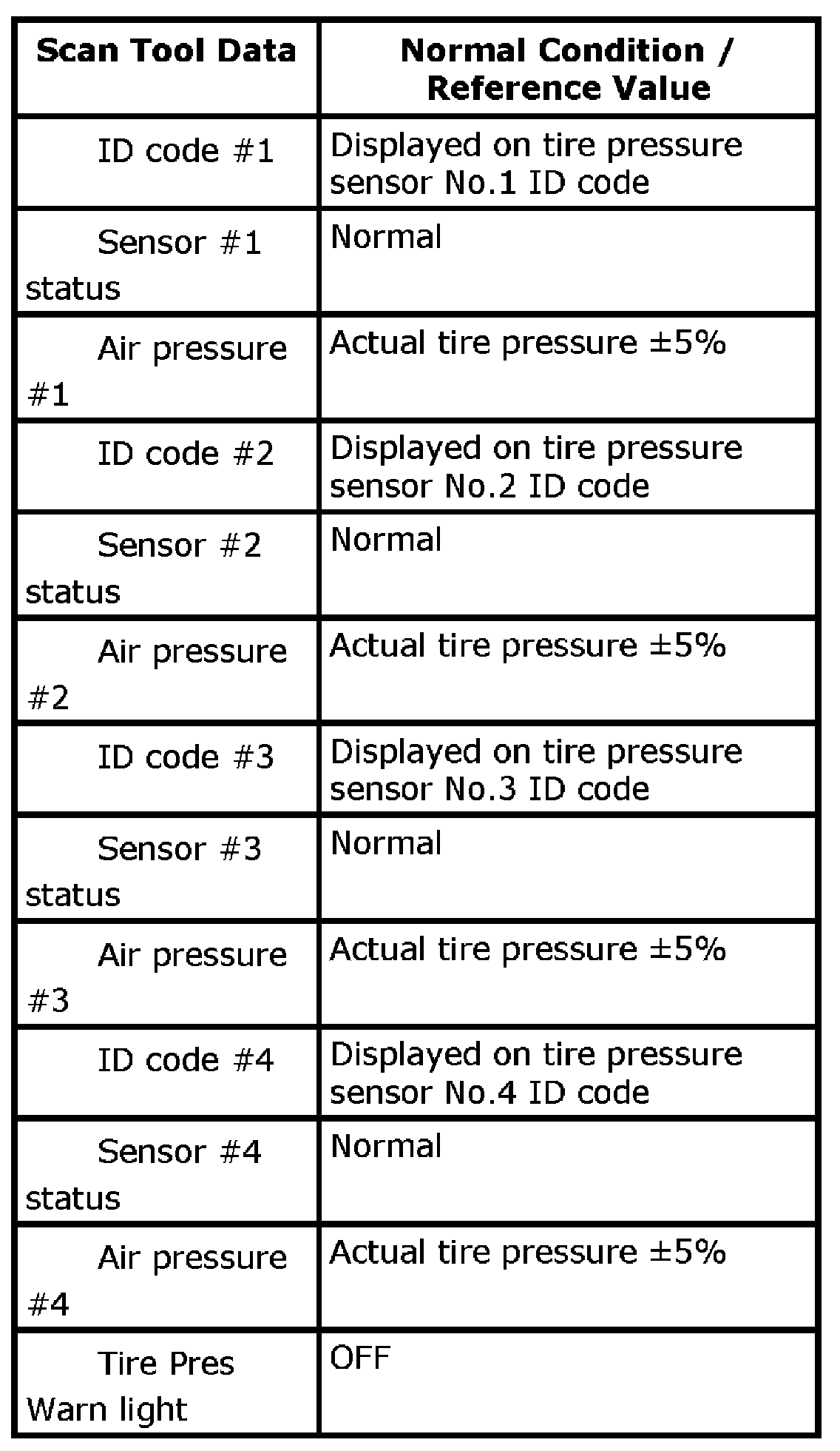 This parameter indicates the operational condition of the tire pressure sensor. For farther detail, refer to Tire Pressure Monitoring System Description for transmitting condition of tire pressure sensor.