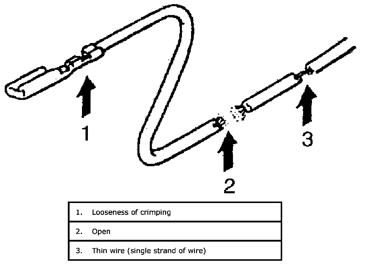 Possible causes for the open circuit are as follows. As the cause is in the connector or terminal in many cases, they need to be checked particularly carefully.